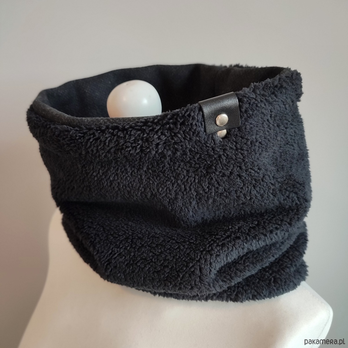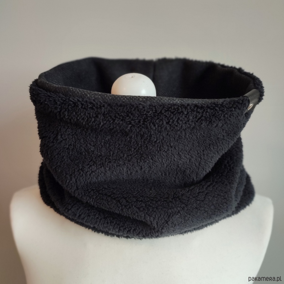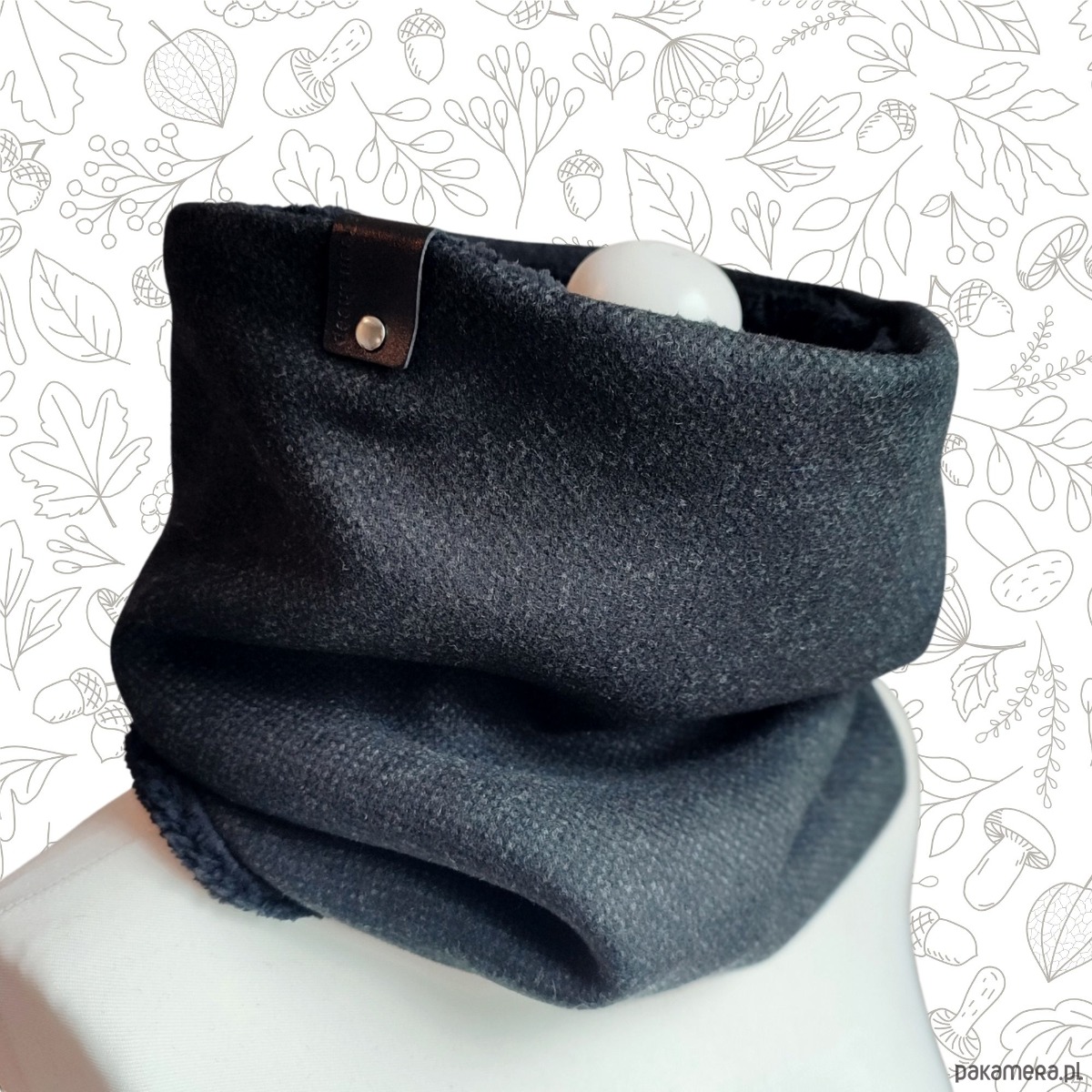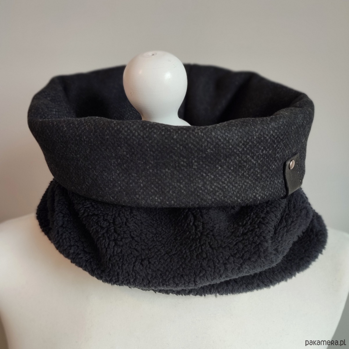 Bardzo starannie wykonany komin wykonany z 2 warstw materiału. Wierzchnia - gładka tkanina wełniana (włoska, super jakości) w kolorze czarnym; spód z bardzo miękkiej, miłej w dotyku i ciepłej tkaniny imitującej baranka. Szal zdobiony jest ręcznie tłoczoną metką z naturalnej skóry w kolorze czarnym.