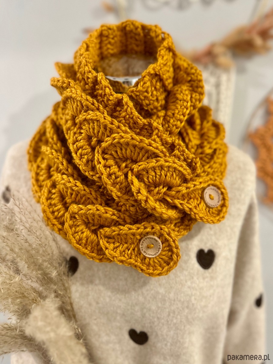 Wykonany na szydełku z wyjątkowej mieszanki: 25% alpaka, 25% wełna, 50% akryl premium – dzięki temu jest jednocześnie ciepły, delikatny i przyjemny w noszeniu. Piękna struktura i ozdobne liście sprawiają, że prezentuje się naprawdę efektownie.