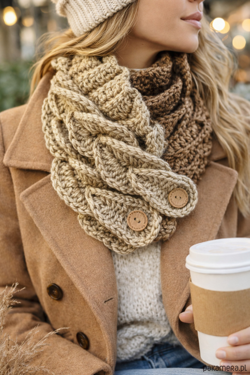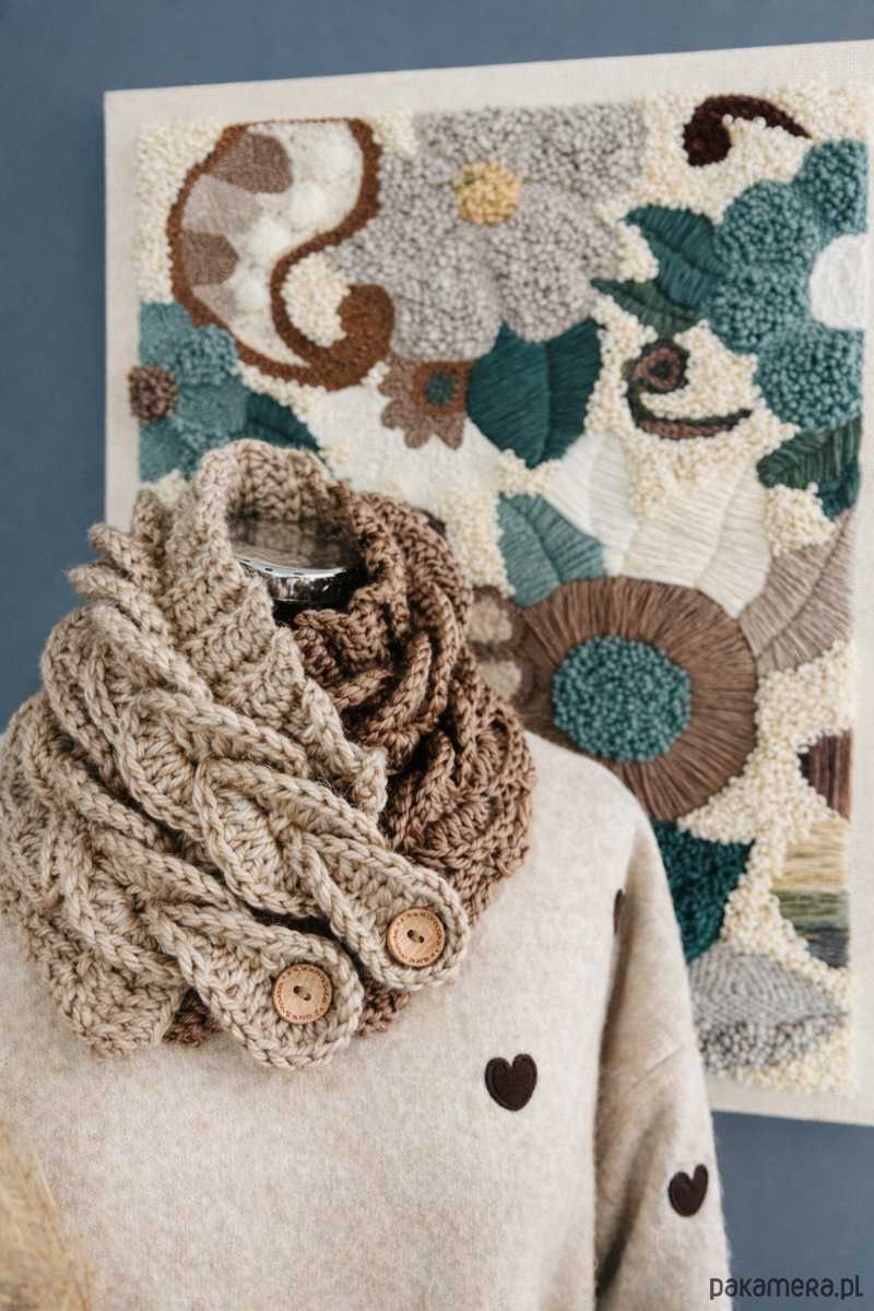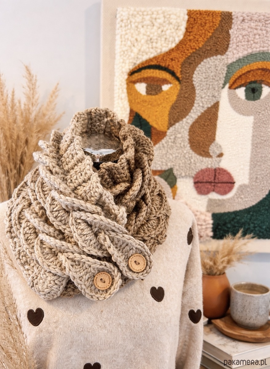 Komin wykonany na szydełku z wyjątkowej mieszanki: 25% alpaka, 25% wełna, 50% akryl premium - dzięki temu jest jednocześnie ciepły, delikatny i przyjemny w noszeniu. Piękna struktura i ozdobne liście sprawiają, że prezentuje się naprawdę efektownie.