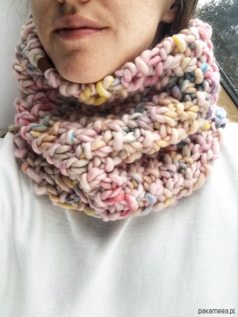 *Nowy komin w momencie pierwszego założenia dość mocno otula szyję. W trakcie noszenia, po kilku dniach, rozciągnie się o 4-5 cm (na płasko), dzięki czemu będzie się łatwiej układał.