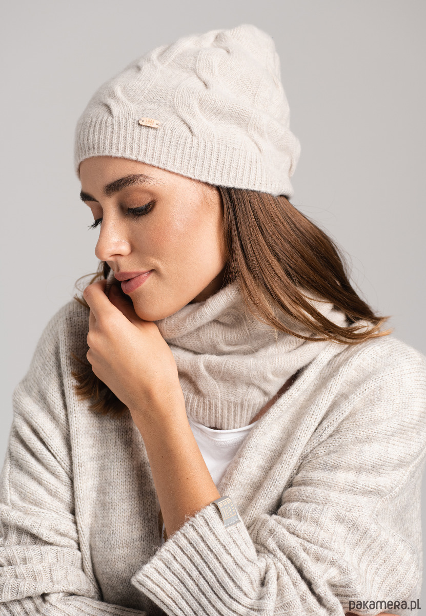 Wykonany z przędzy wełnianej z kaszmirem o warkoczowym splocie. Jest miły, delikatny i miękki w dotyku, wykonany z wysokiej jakości niegryzącej przędzy z wełny merynosów z dużą zawartością kaszmiru, przez co jest miękki i delikatny w dotyku. Właściwości wełny merynosów to przede wszystkim cienkie włókno, miękkie w dotyku, oddychające i antybakteryjne. Zimą chroni przed największymi mrozami. Nie pochłania zapachów i nie rozciąga się.