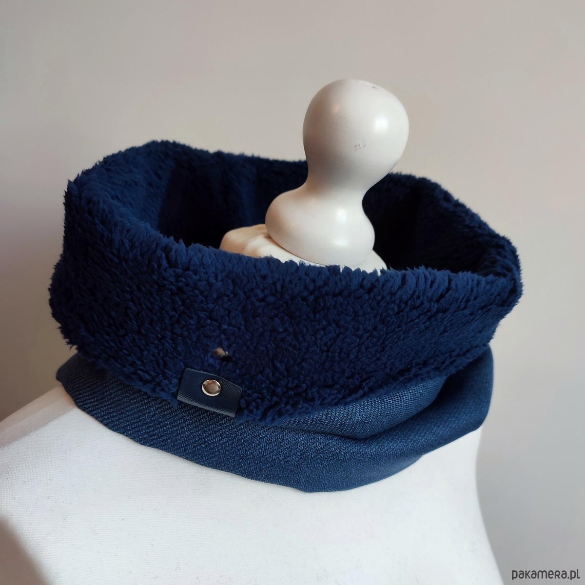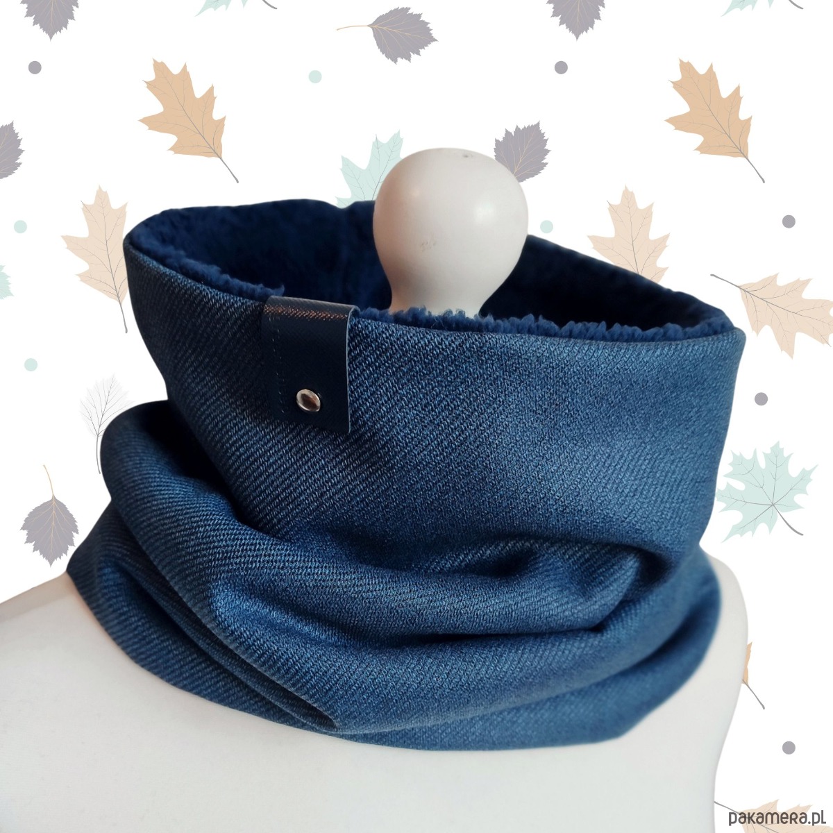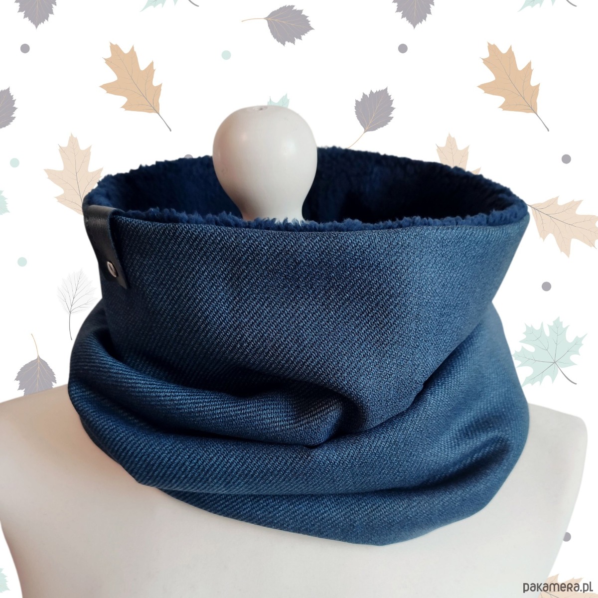 Bardzo starannie wykonany komin wykonany z 2 warstw materiału. Wierzchnia - tkanina wełniana (włoska, super jakości) w kolorze - piękny, granatowy kolor; spód z bardzo miękkiego, bardzo miłego w dotyku i ciepłego polaru w kolorze tym samym kolorze. Szal zdobiony jest ręcznie tłoczoną metką z naturalnej skóry w pasującym kolorze.