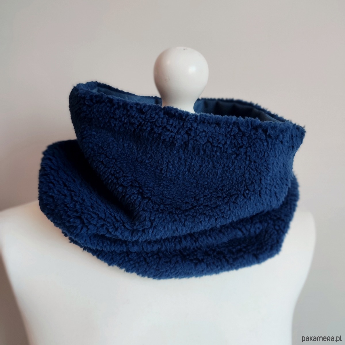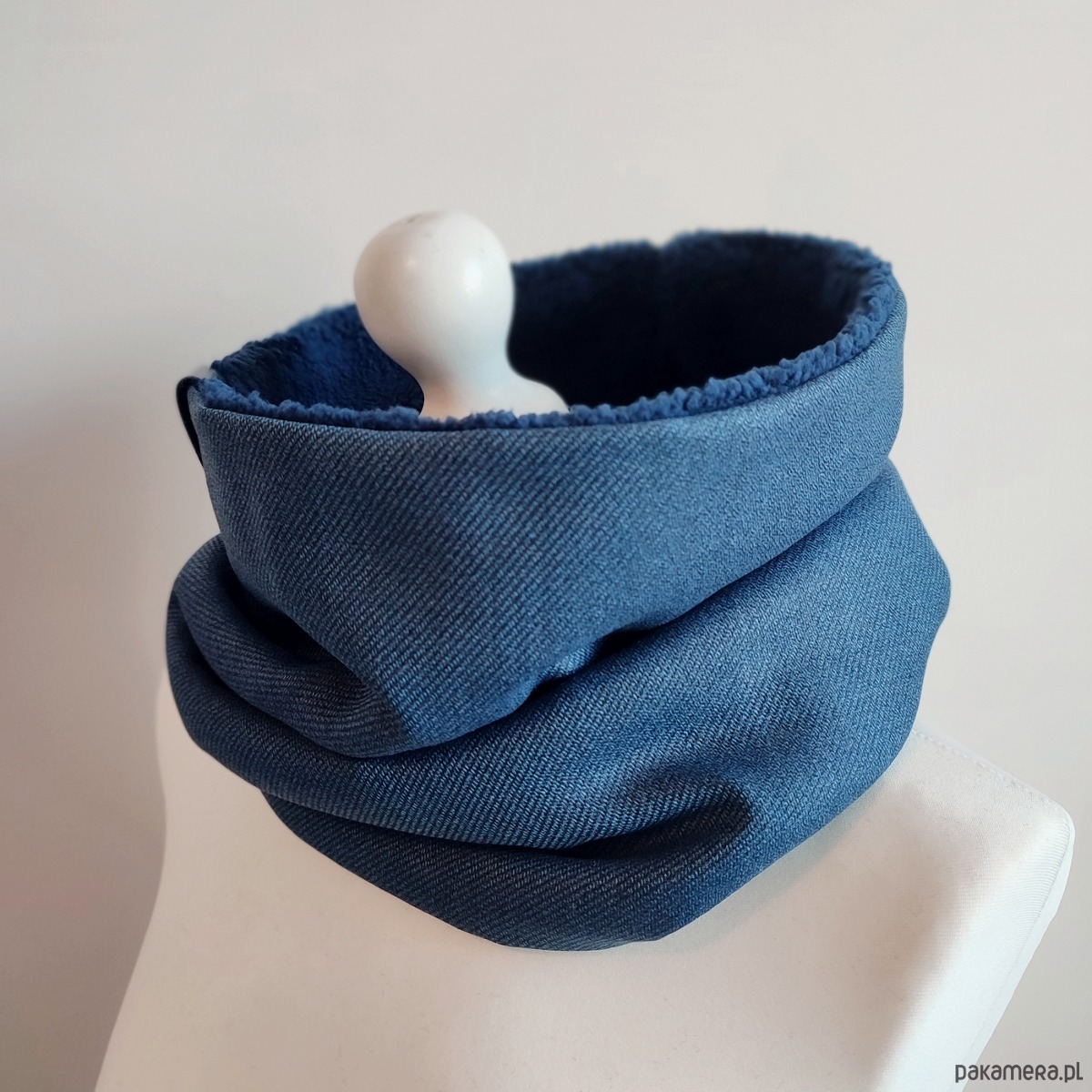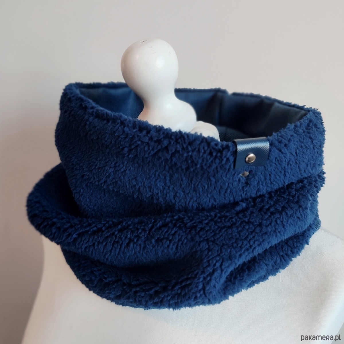Bardzo starannie wykonany komin wykonany z 2 warstw materiału. Wierzchnia - tkanina wełniana (włoska, super jakości) w kolorze - piękny, granatowy kolor; spód z bardzo miękkiego, bardzo miłego w dotyku i ciepłego polaru w kolorze tym samym kolorze. Szal zdobiony jest ręcznie tłoczoną metką z naturalnej skóry w pasującym kolorze.