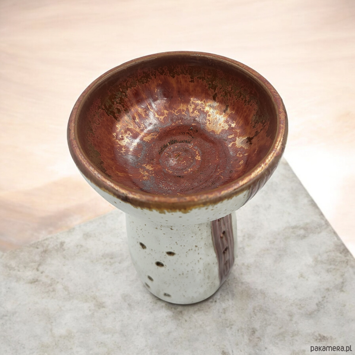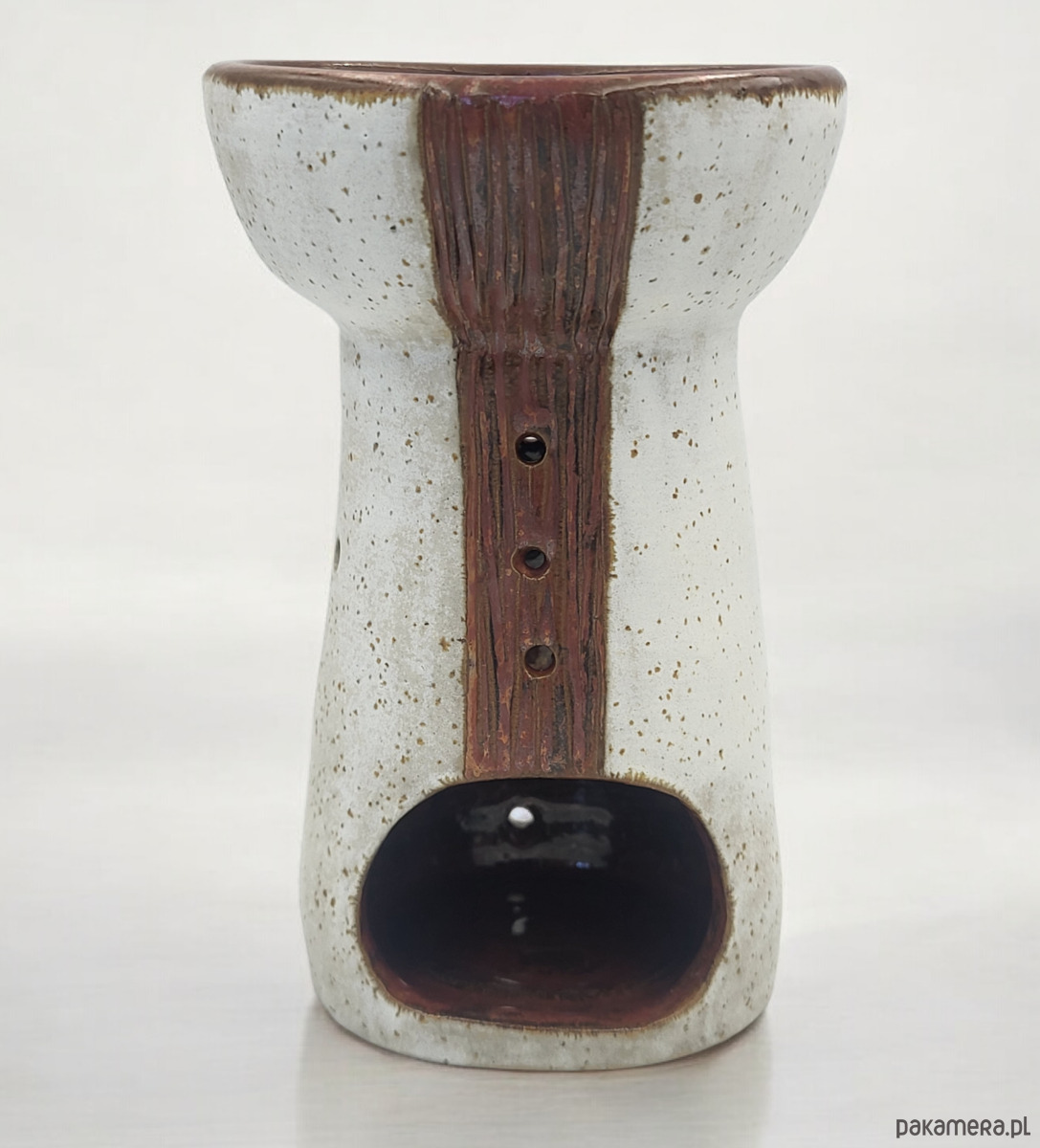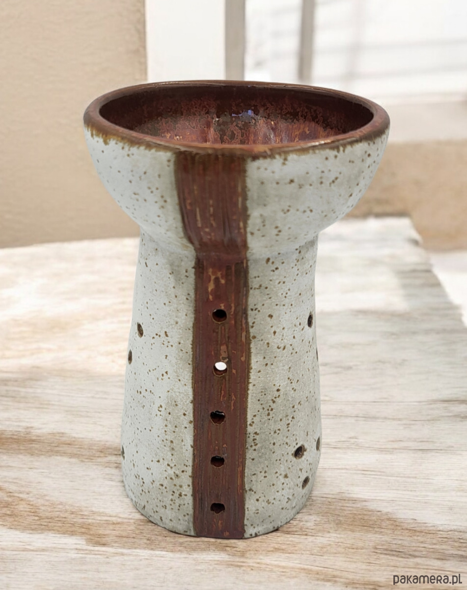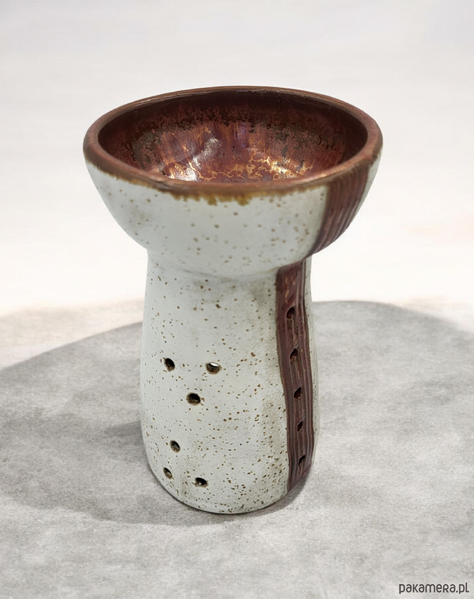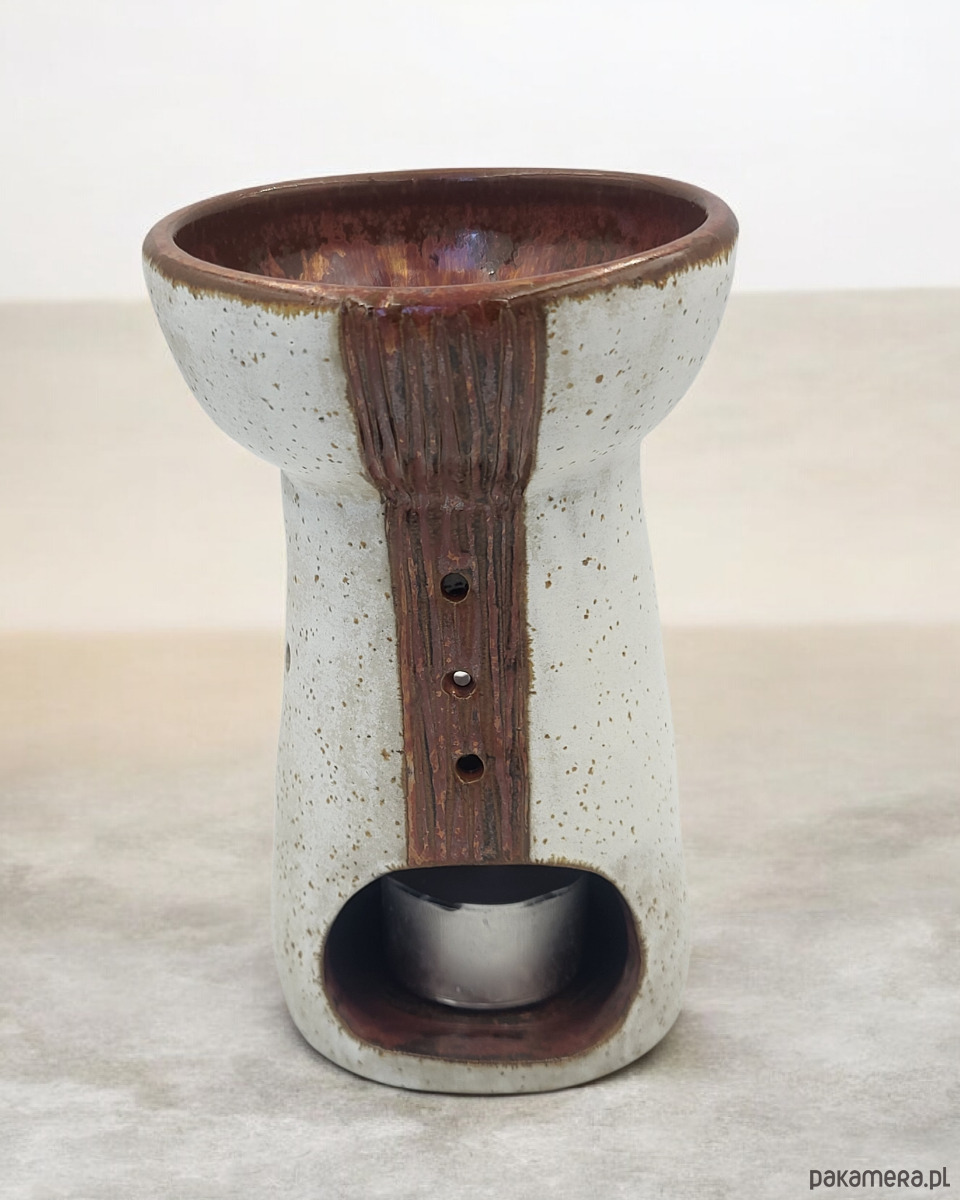 Piękny, ceramiczny kominek do aromaterapii w odcieniach bieli i miedzi