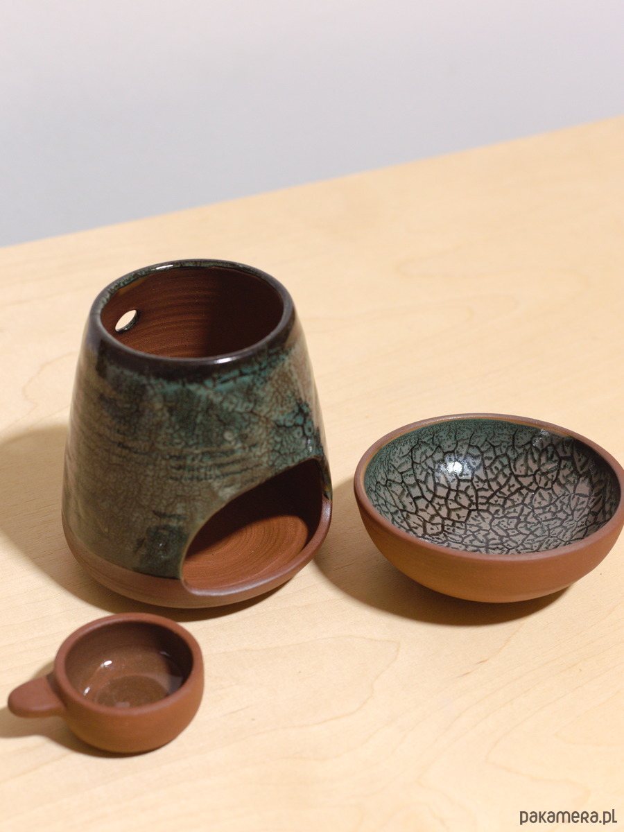 Składa się z trzech części: podstawki, miseczki i pojemnika na małą świeczkę typu tealight.