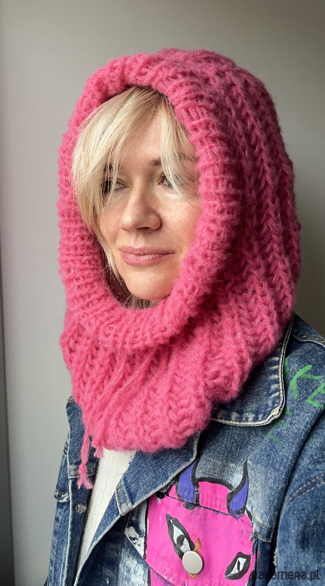 Zrobiona przeze mnie na drutach z wysokogatunkowej włóczki (w składzie 50 % alpaka, 33 % bawełna i 17% wełny. Jest bardzo ciepła i miła w dotyku; posiada praktyczny sznureczek do regulacji.