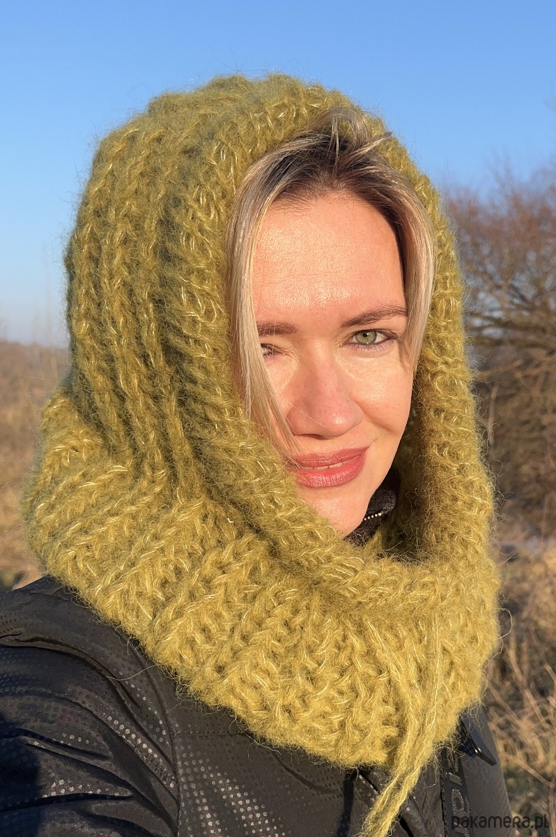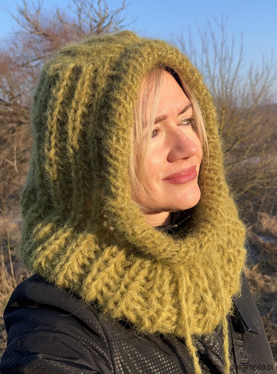 Zrobiona przeze mnie na drutach z wysokogatunkowej włóczki (w składzie alpaka i jedwab). Jest bardzo ciepła i miła w dotyku; posiada praktyczny sznureczek do regulacji.
