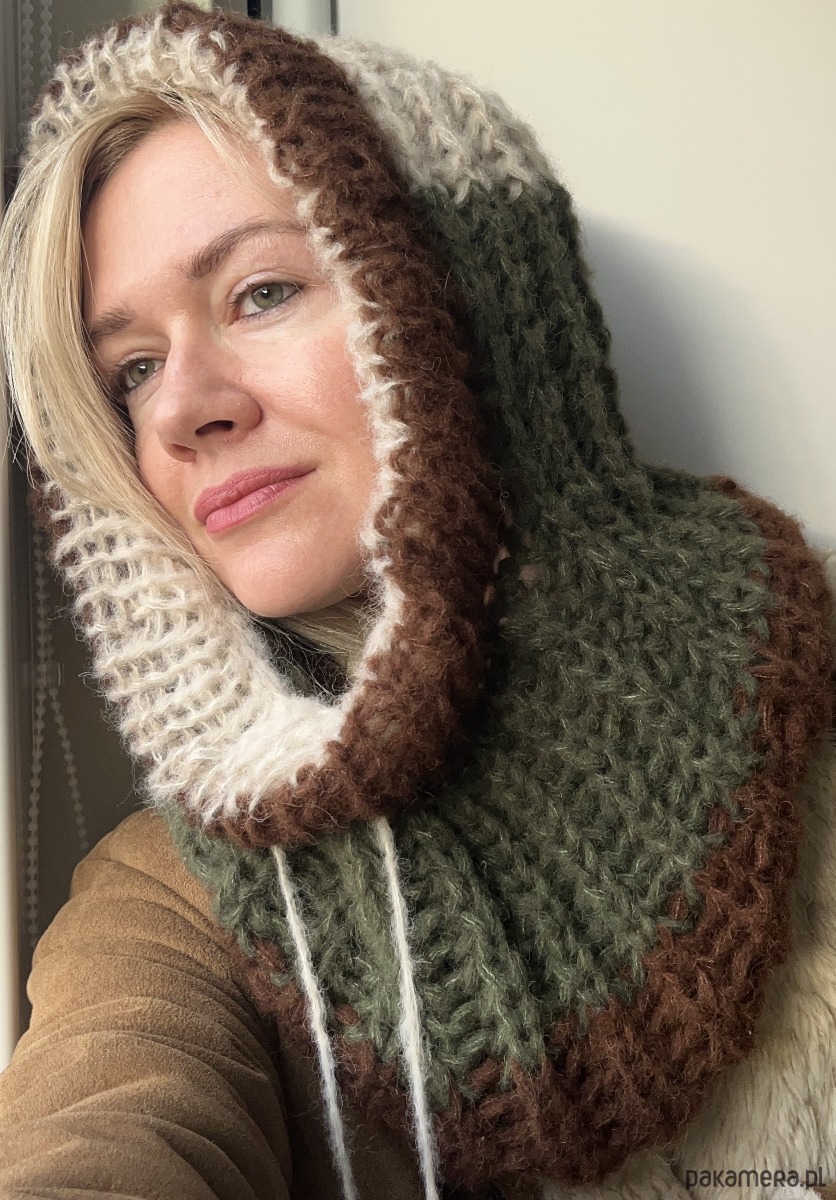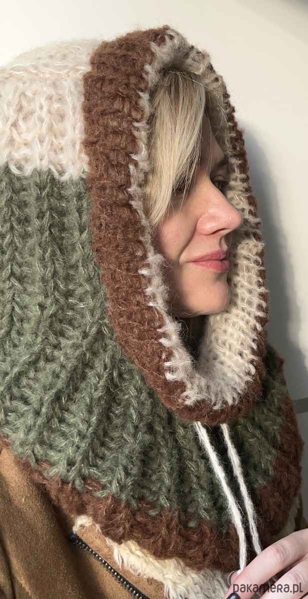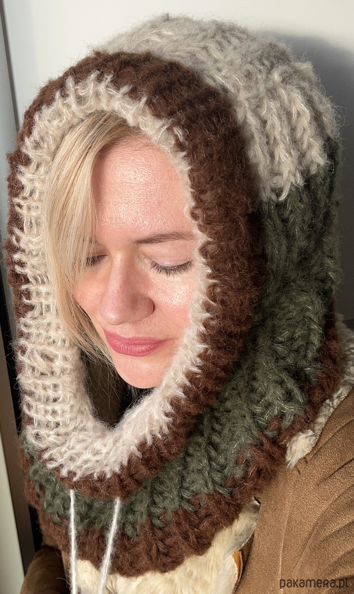 Zrobiona przeze mnie na drutach z wysokogatunkowej włóczki (w składzie 70%alpaka, 30% jedwab). Jest bardzo ciepła i miła w dotyku; posiada praktyczny sznureczek do regulacji.