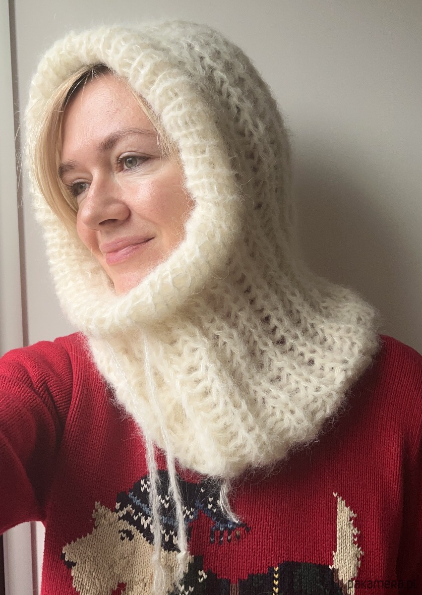 Zrobiona przeze mnie na drutach z wysokogatunkowej włóczki (w składzie: alpaka i jedwab). Jest bardzo ciepła, lekka i przemiła w dotyku. Posiada regulację.