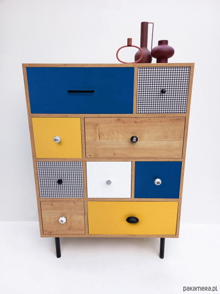 Mebel charakteryzuje się ciekawym układem, różnorodną kolorystyką, a całość dopełniają oryginalne uchwyty:-)