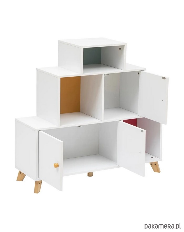 Bardzo ciekawa komoda do pokoju dziecięcego. Wykonana z MDF w kolorze białym. Nóżki to drewno sosnowe. Idealna na książki, przybory szkolne i inne dziecięce skarby.