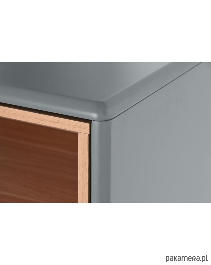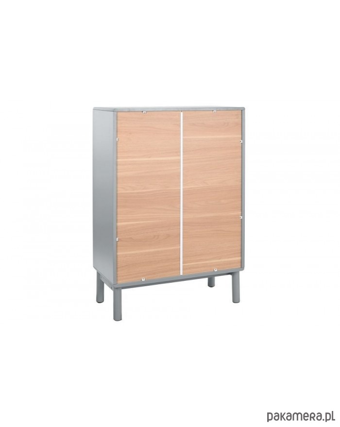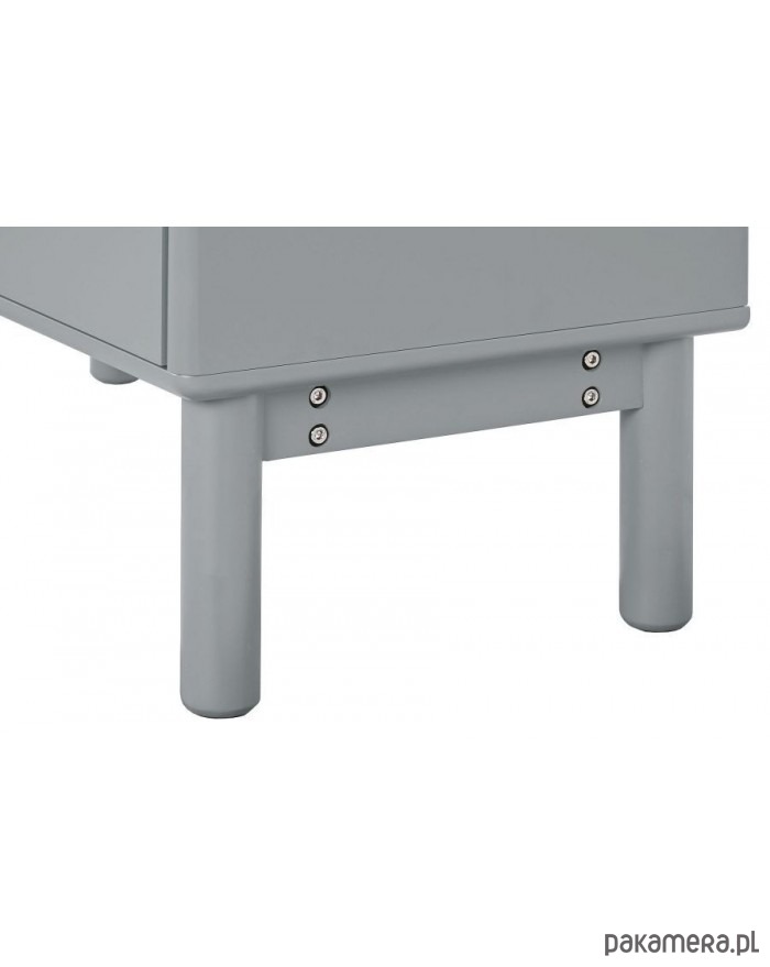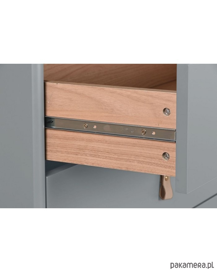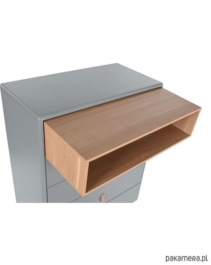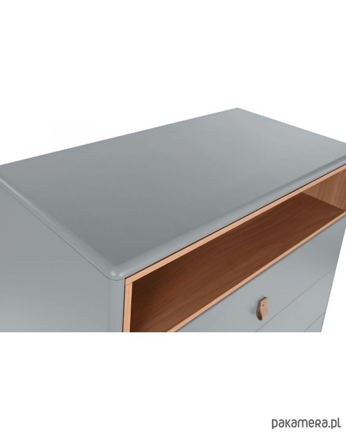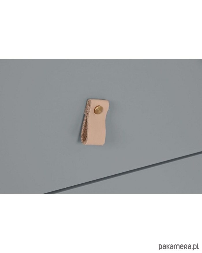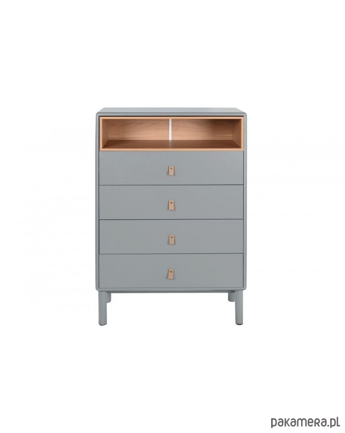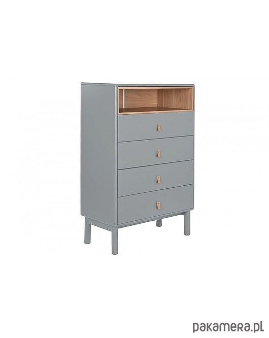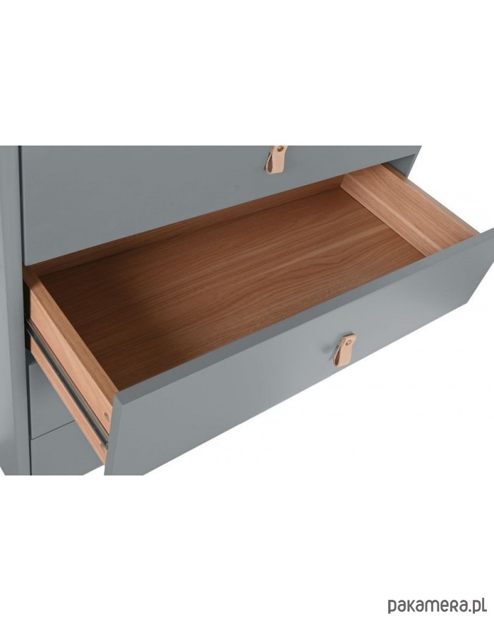 Wysoka komoda w stylu skandynawskim, wykonana z płyty MDF w kolorze szarym. Wyposażona została w 4 duże szuflady z jasnymi, skórzanymi uchwytami. W miejscu górnej szuflady umiejscowiono otwarty, brązowy, wysuwany panel. Komoda będzie bardzo użyteczna w np. sypialni do przechowywania bielizny, dziecięcych ubrań itp.