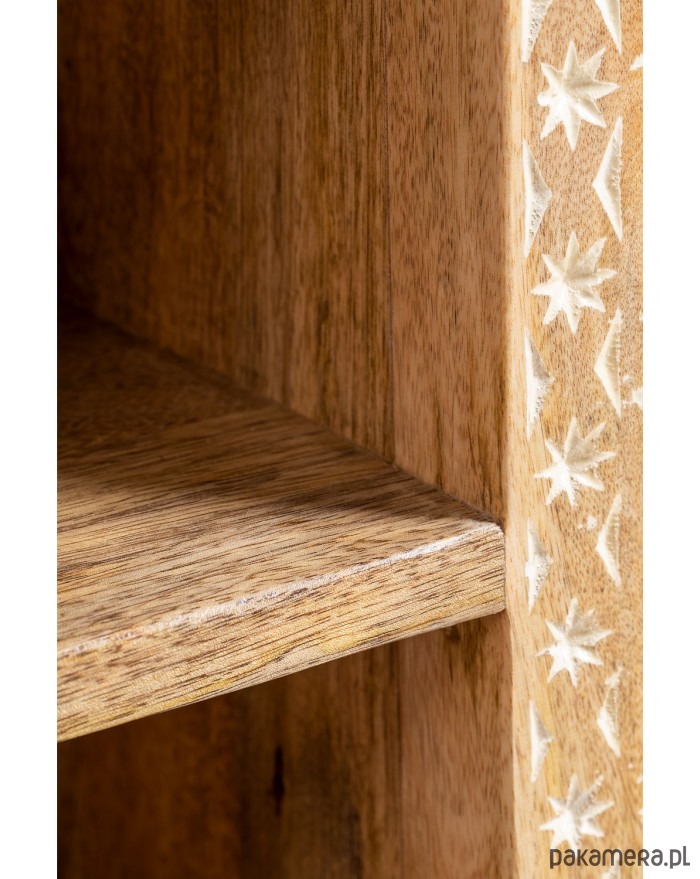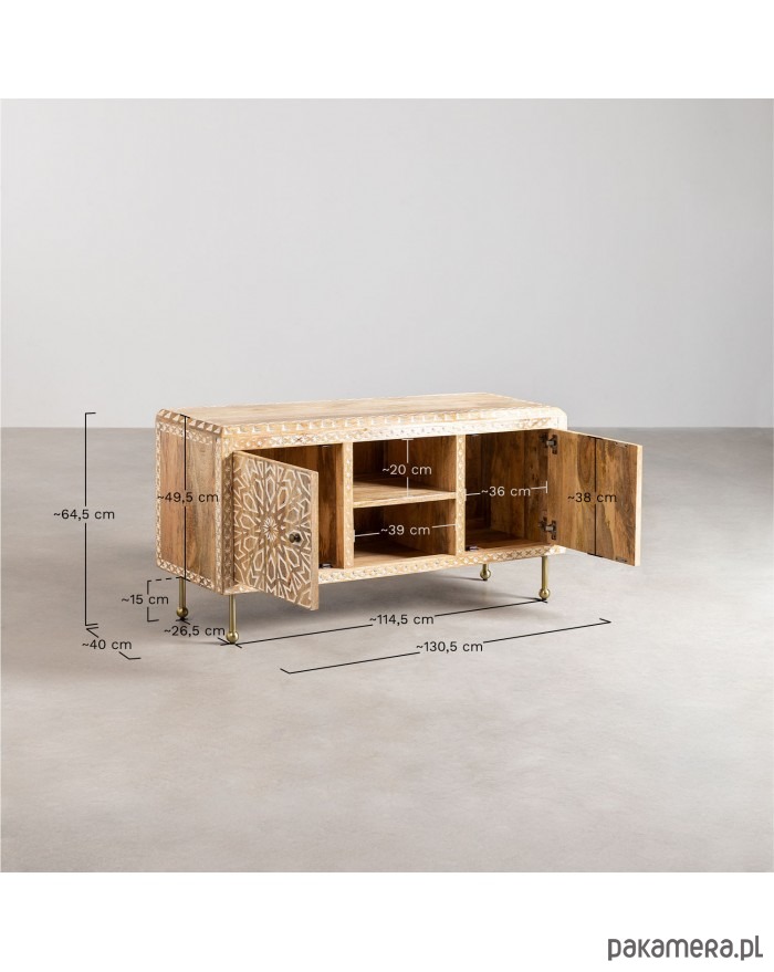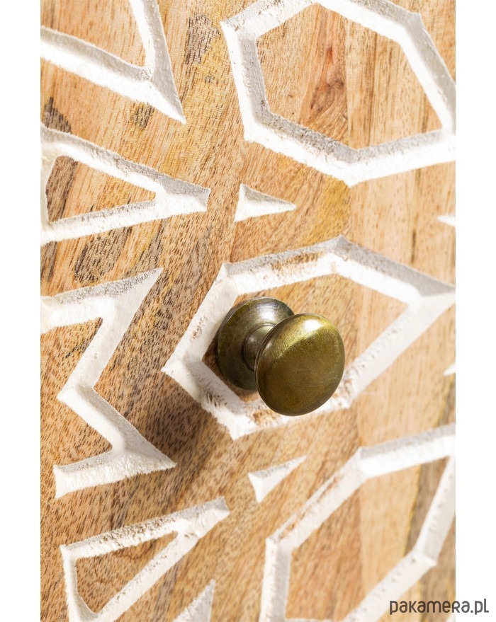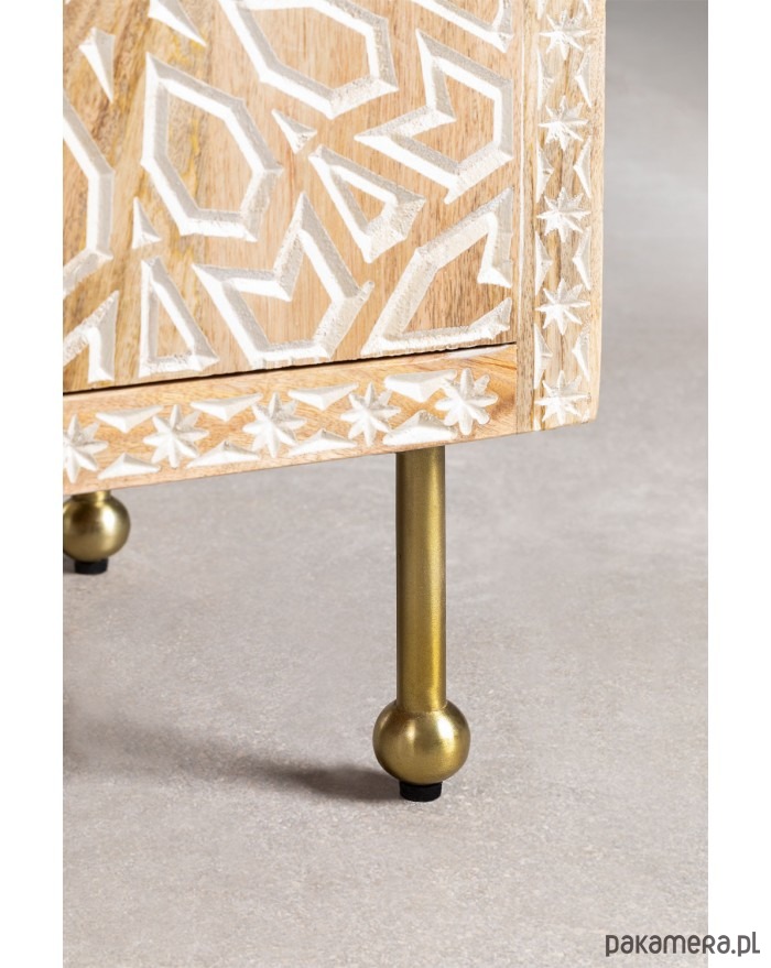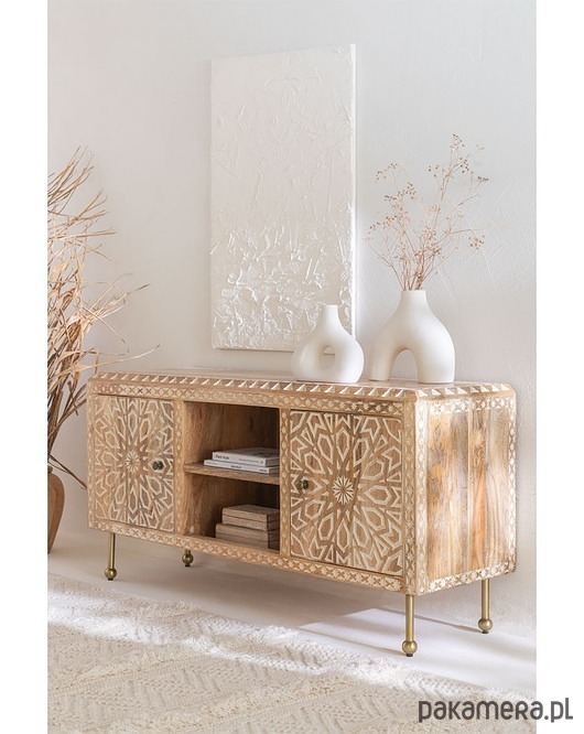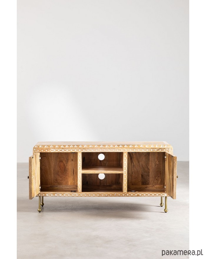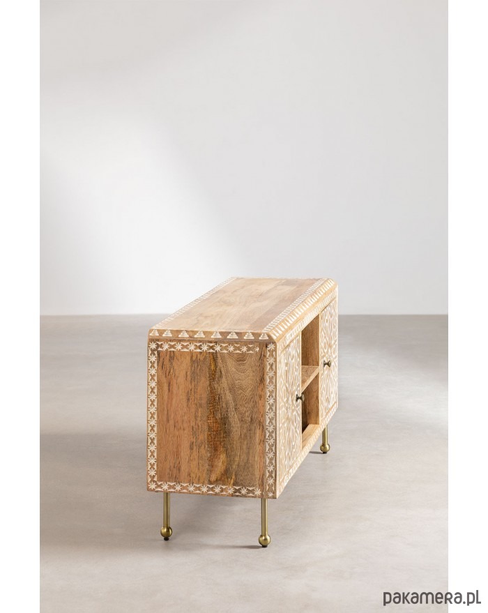 Komoda RTV wykonana ręcznie z drewna mango. Zdobiona w stylu boho rzemieślniczą techniką inkrustacji kostnej. Celowo bielona i postarzana. Postawiona na metalowych nóżkach w kolorze złotego mosiądzu.