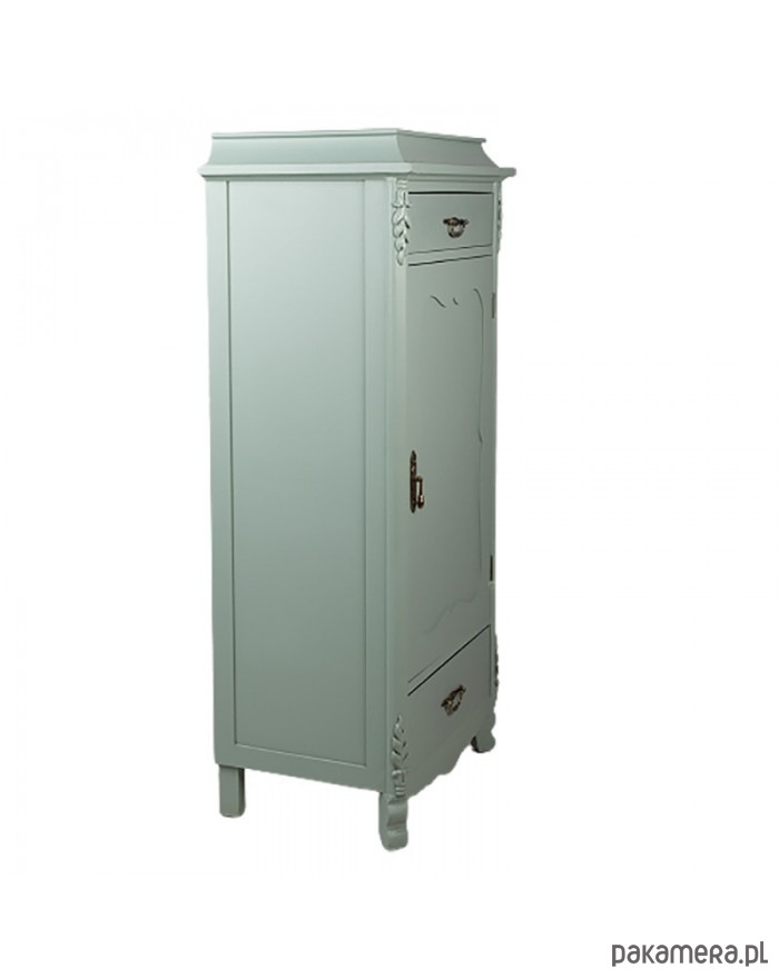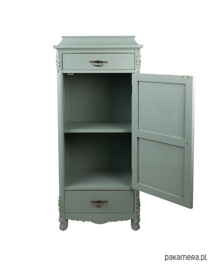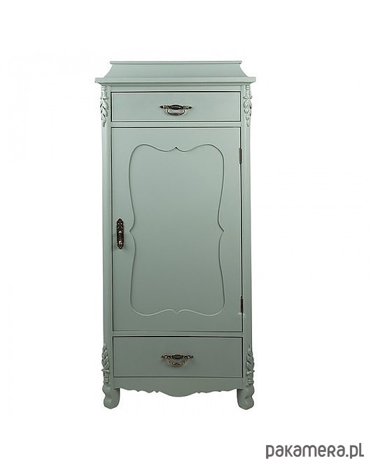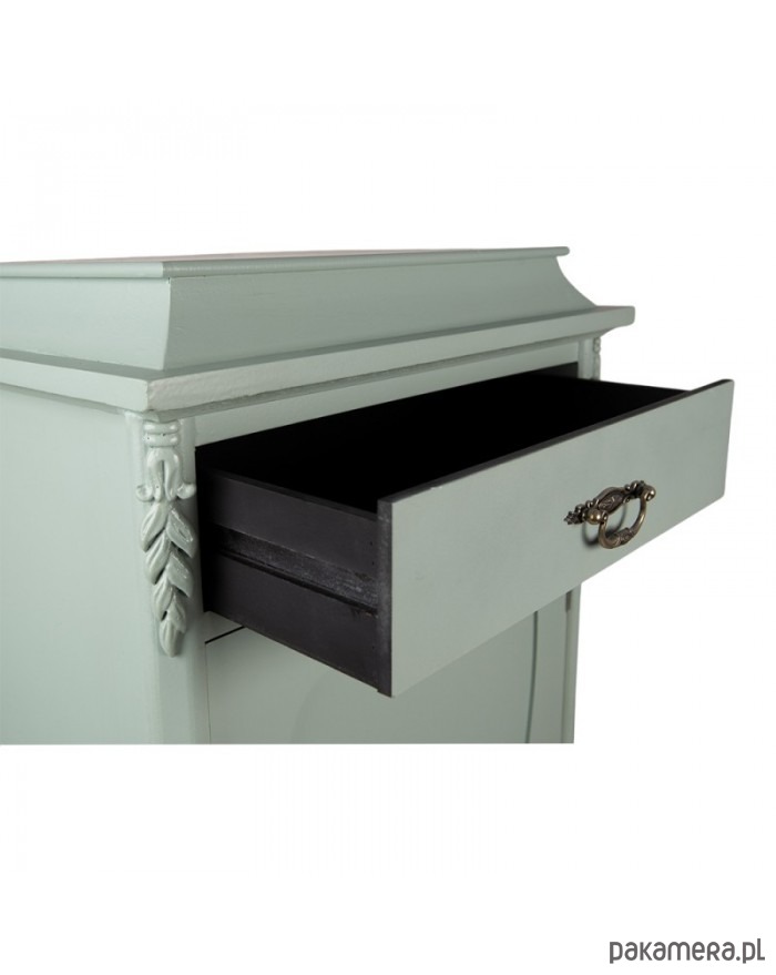 Bardzo ciekawa, drewniana komoda. W bajkowym szaro-miętowym kolorze. Posiada jedną szufladę oraz dwie półki. Idealna do przedpokoju.