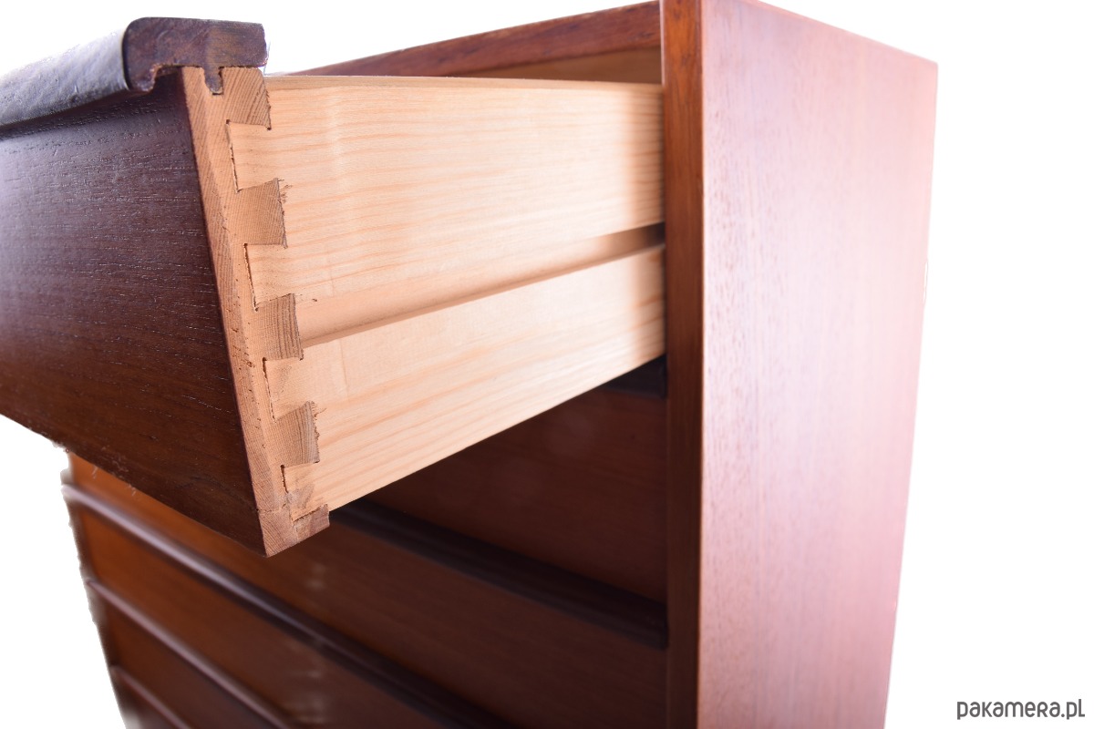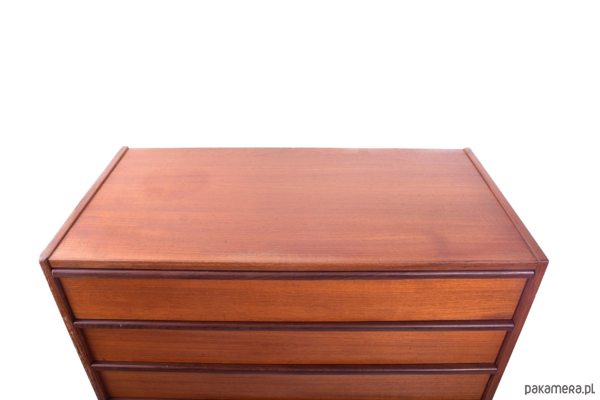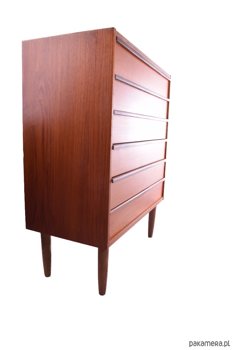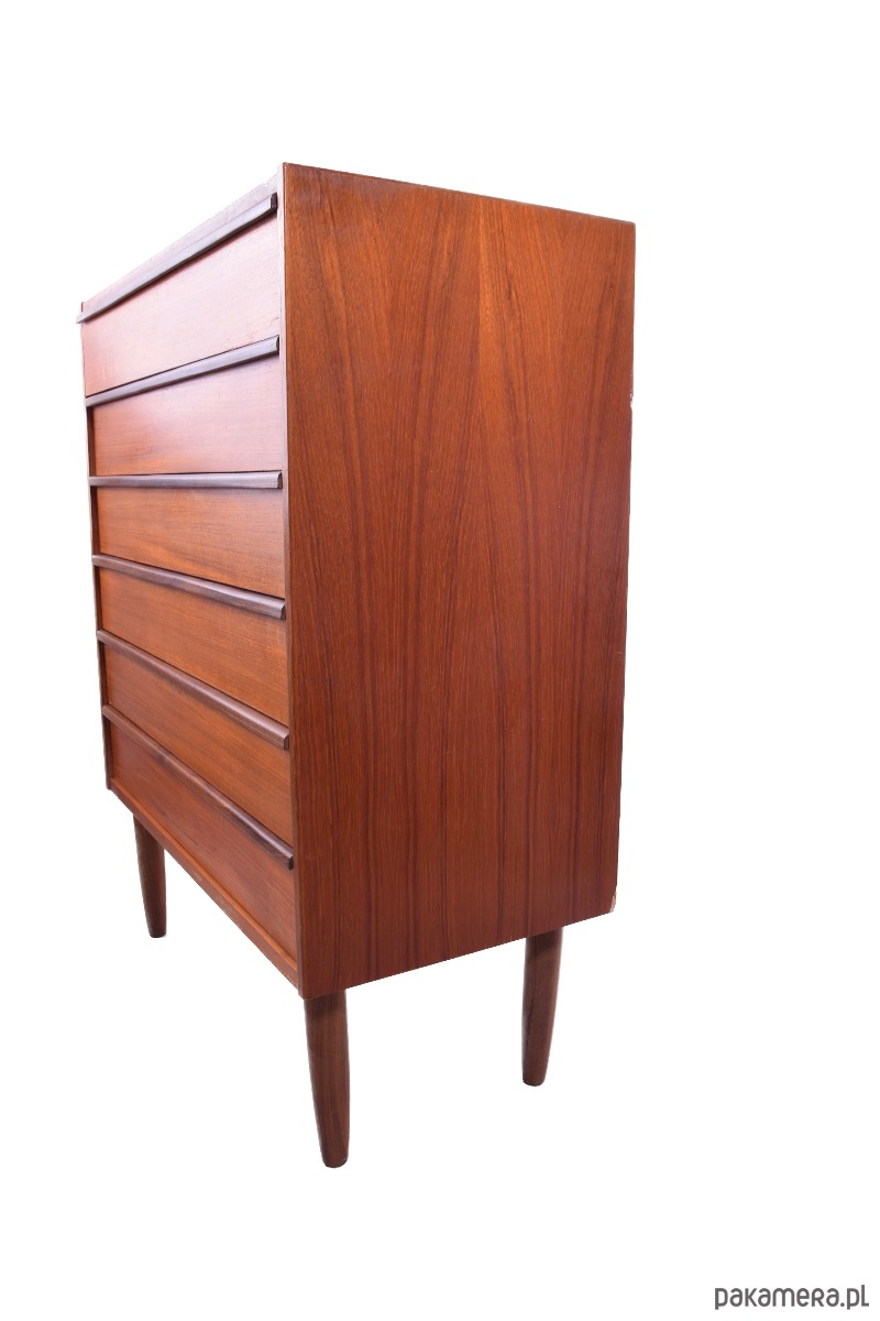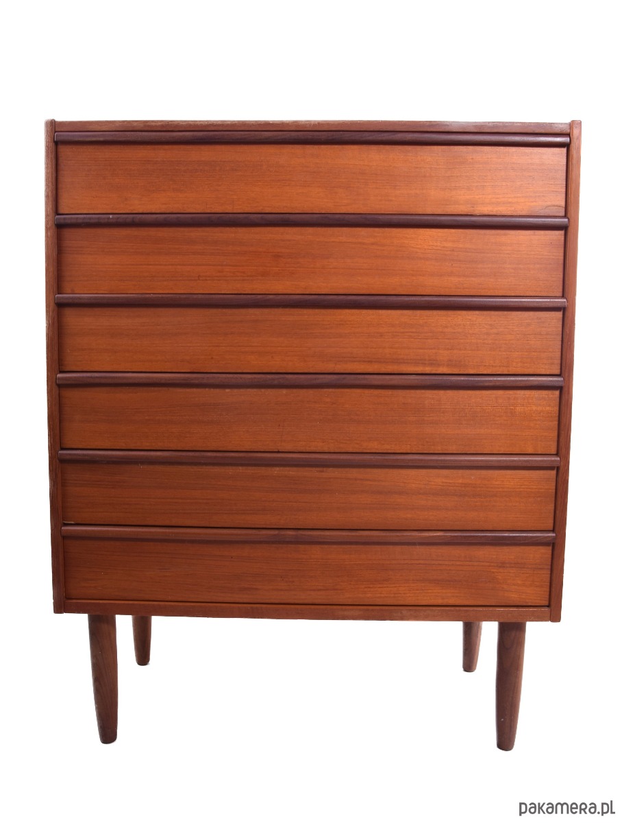 Mebel o wyjątkowo szlachetnej linii – sześć pojemnych szuflad z frezowanymi uchwytami i toczone nogi typowe dla duńskiego wzornictwa tego okresu.