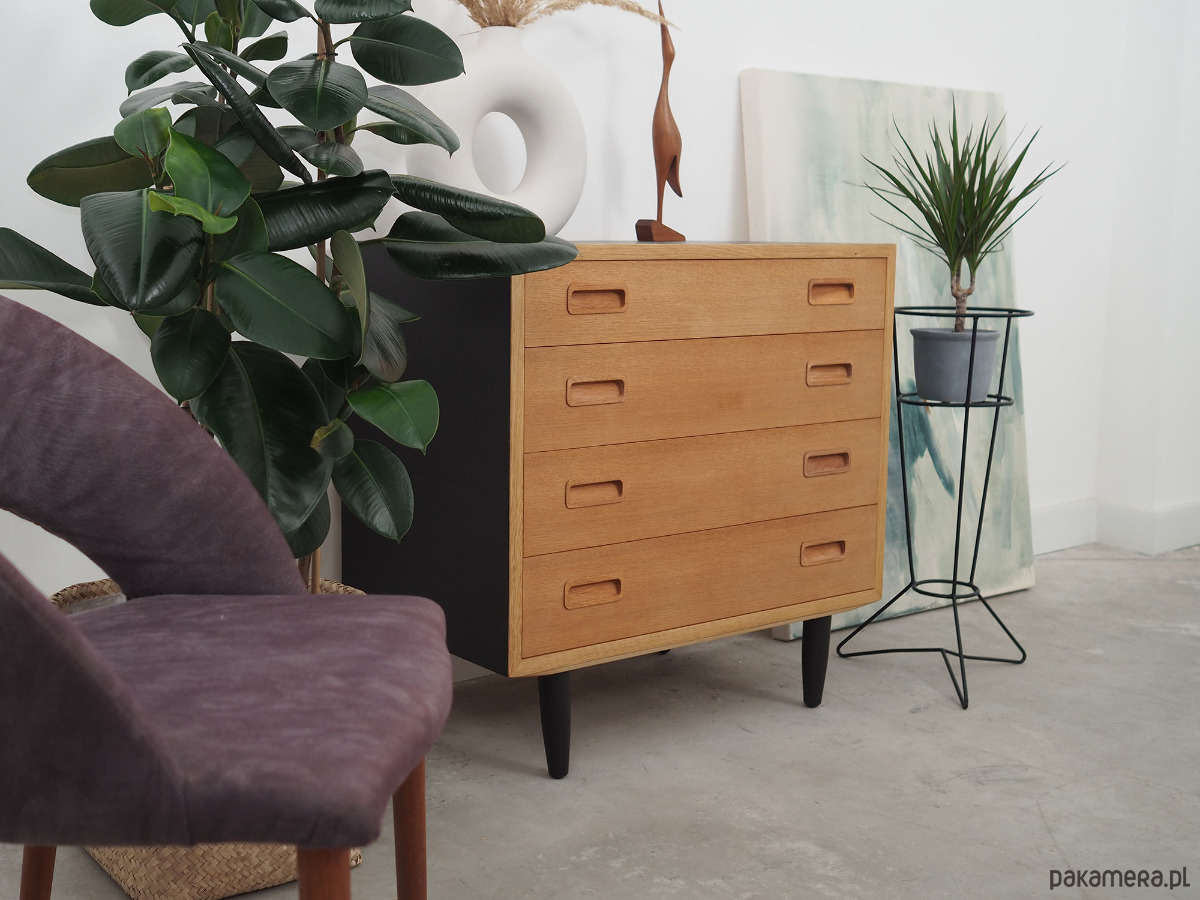 Konstrukcja pokryta jest fornirem jesionowym. Nogi i uchwyty wykonano z litego drewna. Nogi, blat i boki bejcowane na czarno. Powierzchnia po odświeżeniu. Komoda to klasyczna szufladówka idealna do każdej przestrzeni. Dzięki czterem pojemnym szufladom doskonale spełni swoją rolę jako szafka na dokumenty lub zabawki w pokoju dziecięcym lub jako bieliźniarka w sypialni.