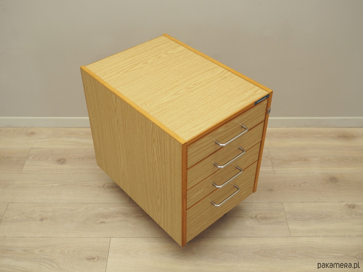 Konstrukcja pokryta jest laminatem. Uchwyty wykonane z metalu. Powierzchnia po odświeżeniu. Komoda to klasyczna szufladówka idealna do każdej przestrzeni. Dzięki czterem praktycznym szufladom spełni idealnie swoją rolę jako szafka na dokumenty. Szuflady posiadają przegródki oraz kasetki.