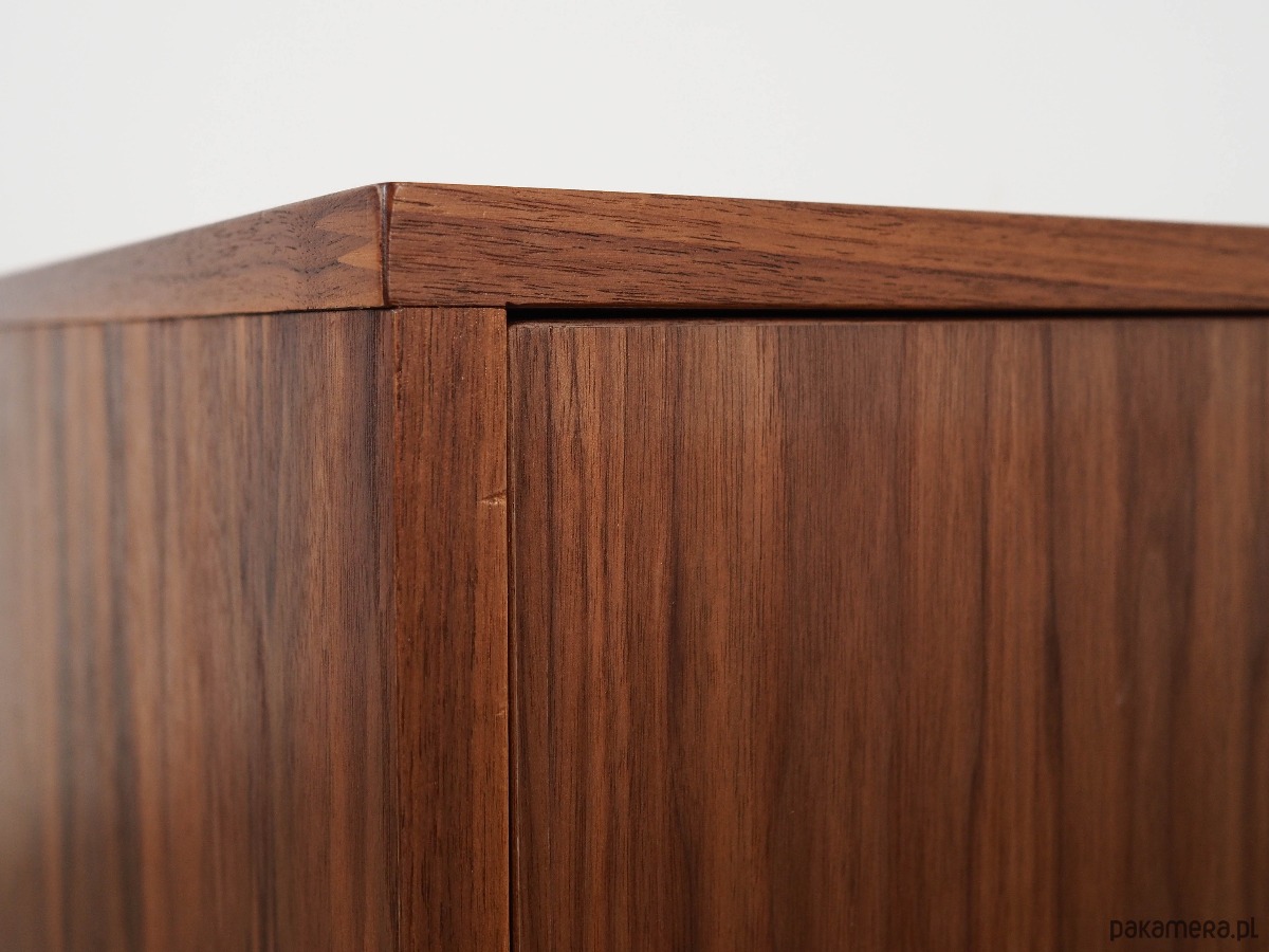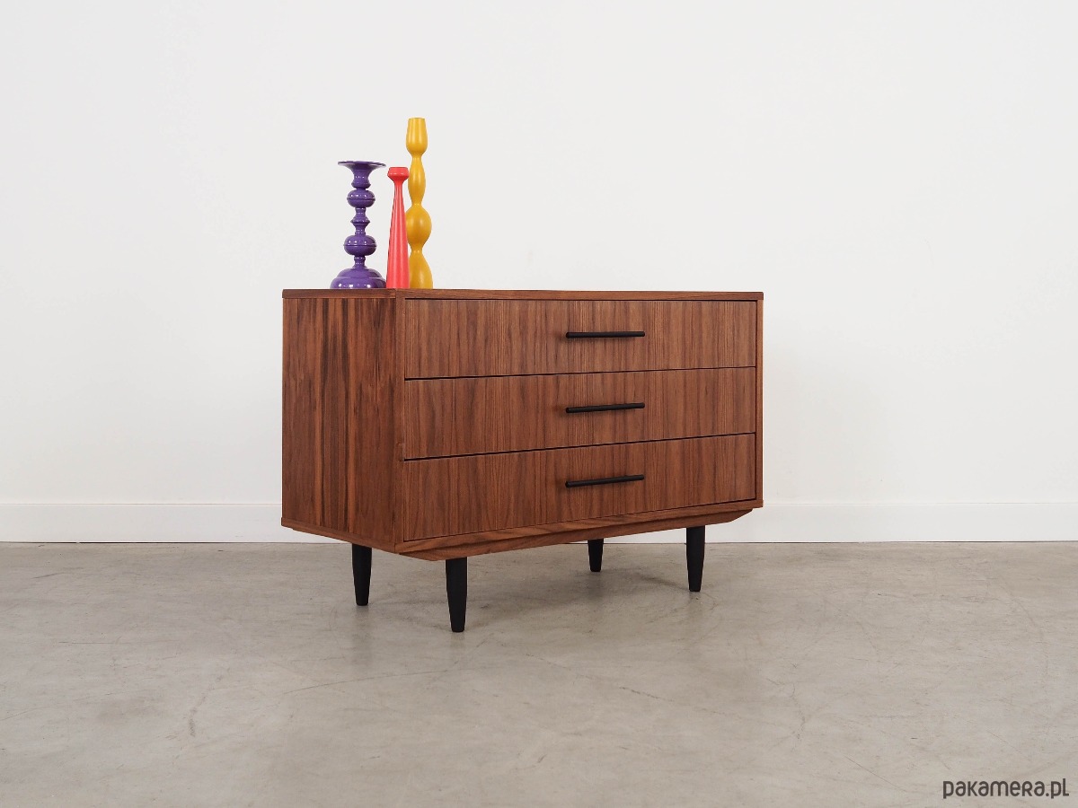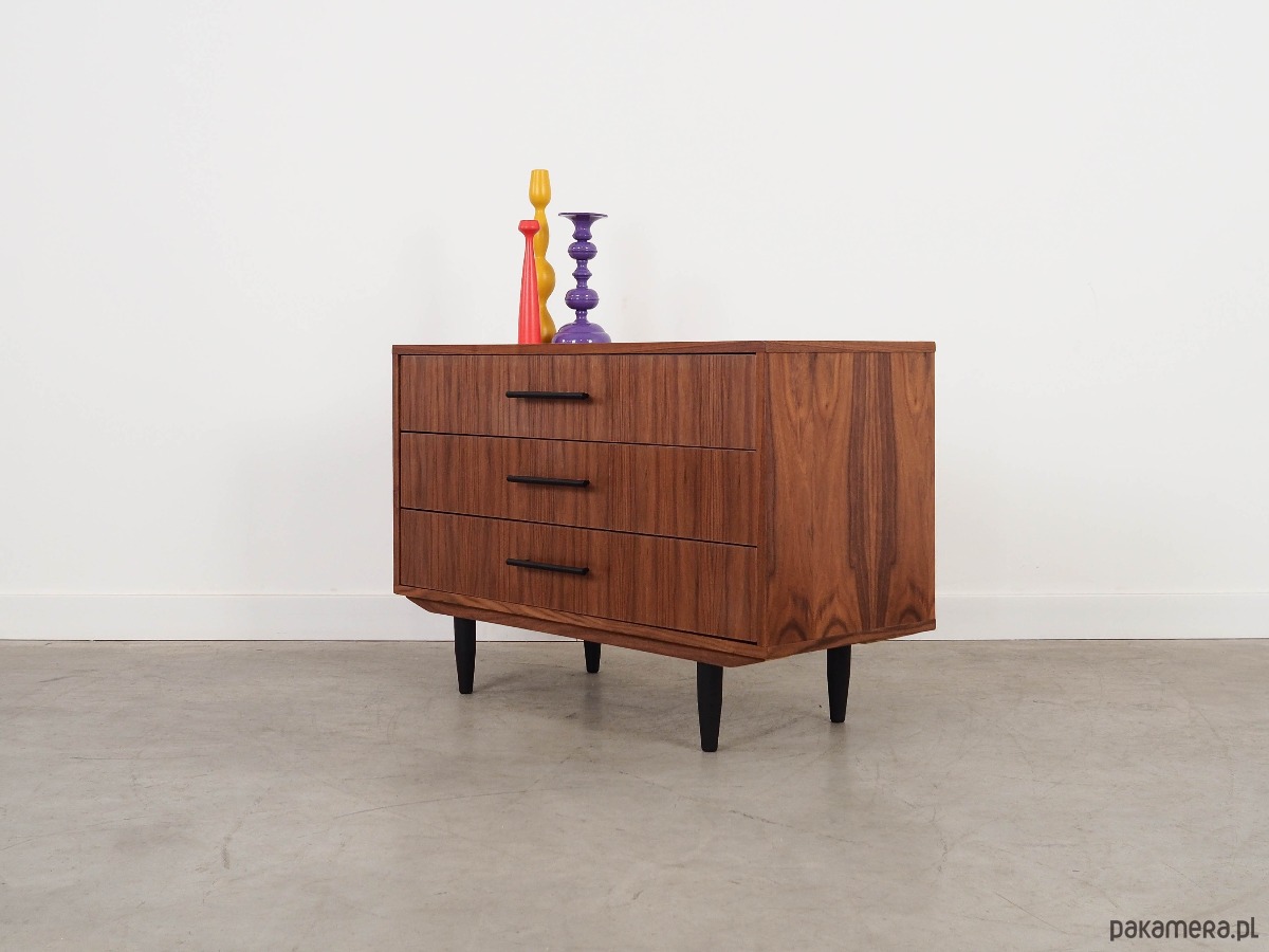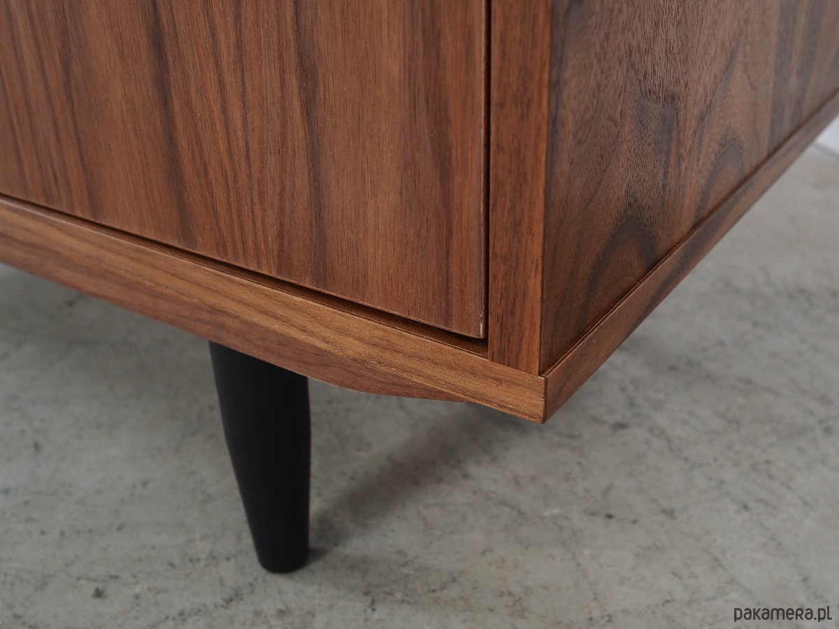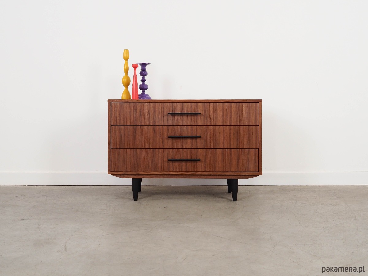 Konstrukcja pokryta jest fornirem orzechowym. Nogi wykonane z litego drewna wybarwionego na kolor czarny. Powierzchnia po odświeżeniu. Komoda to klasyczna szufladówka idealna do każdej przestrzeni. Dzięki trzem pojemnym szufladom spełni idealnie swoją rolę jako szafka na dokumenty, zabawki w pokoju dziecięcym lub jako bieliźniarka w sypialni.