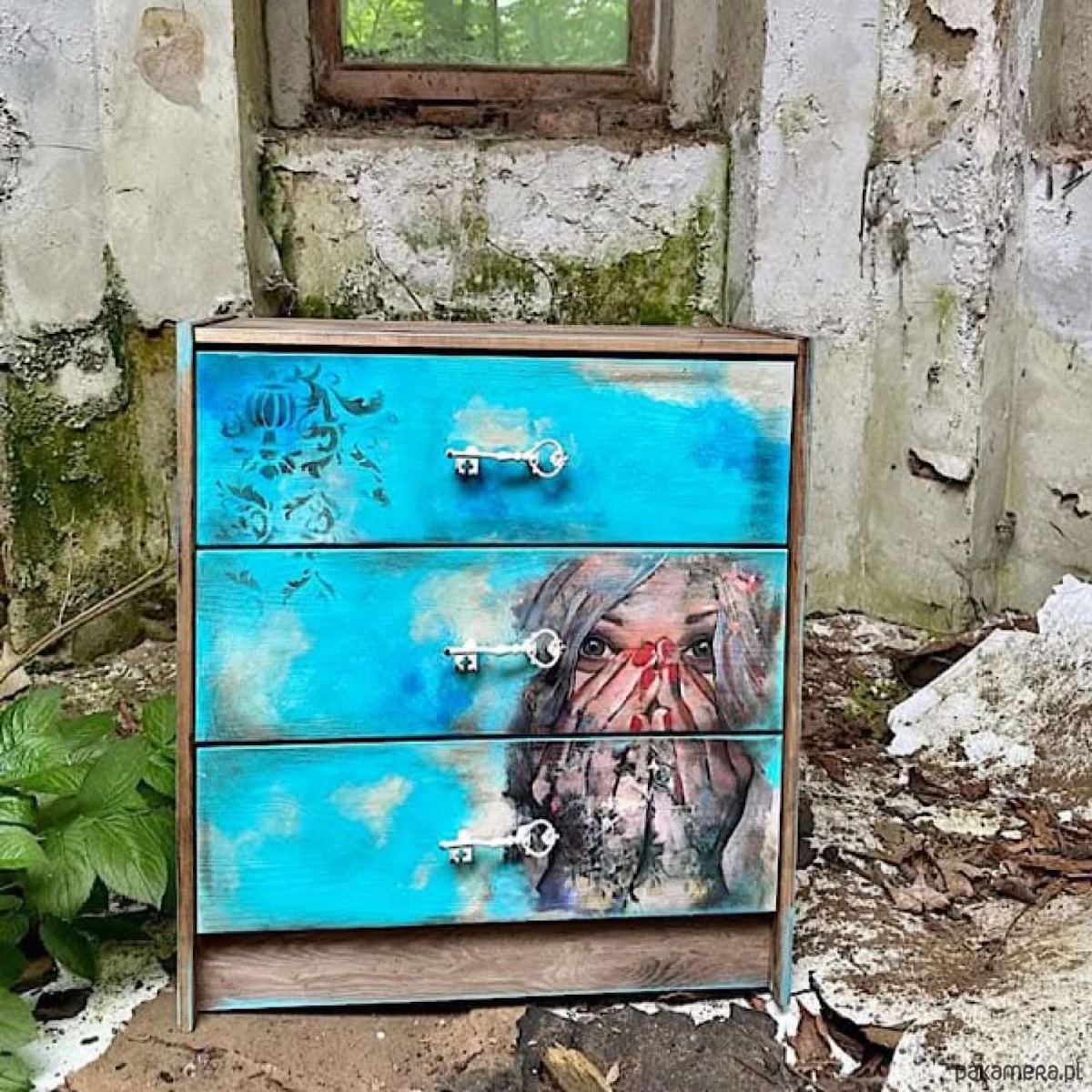 W pracowni Monique Art można zamówić oryginalną komodę dla miłośników ręcznie malowanych mebli. Komoda sosnowa została pomalowana w całości ręcznie farbami kredowymi i bejcą. Uroku dodają oryginalne uchwyty w postaci kluczy.