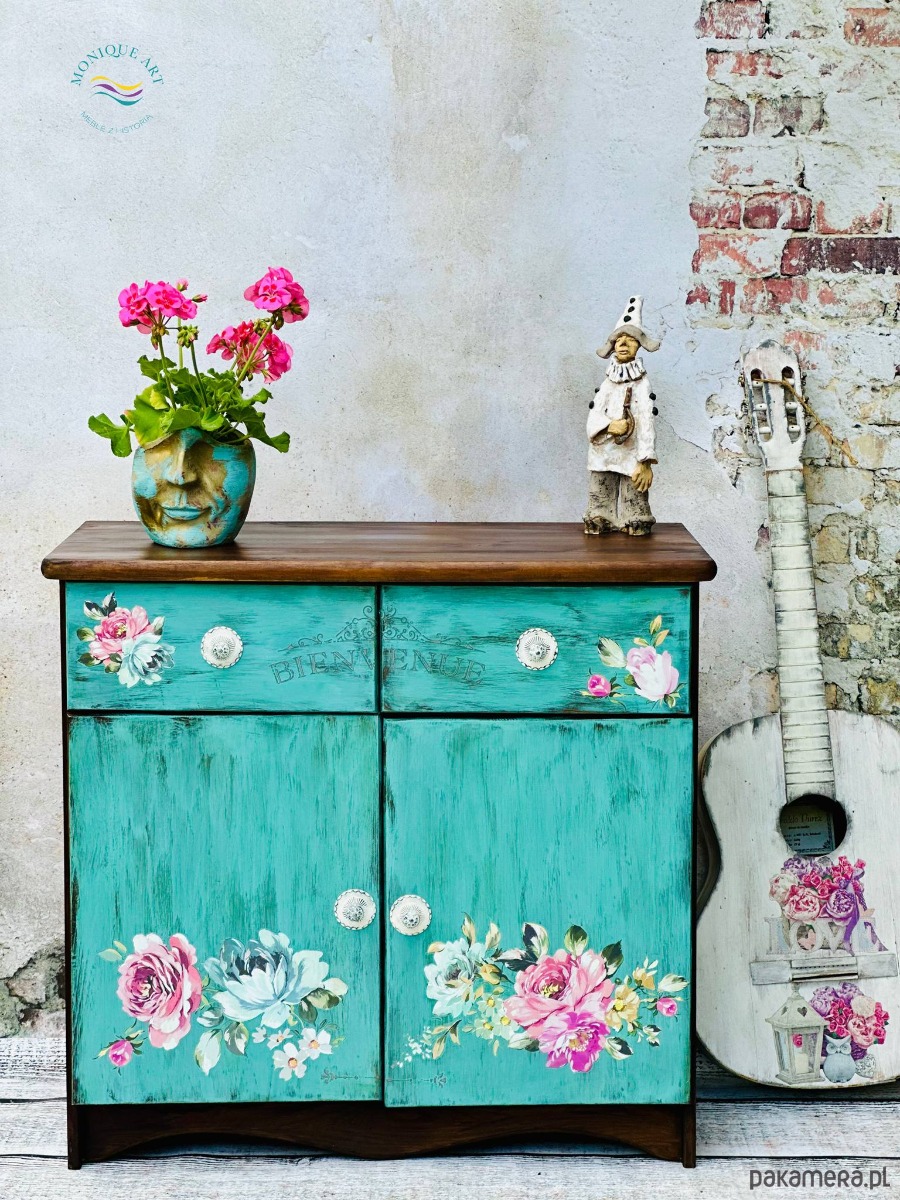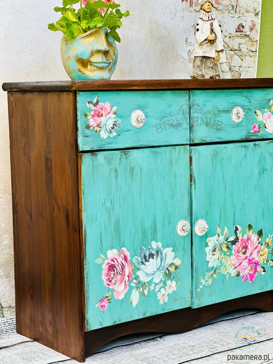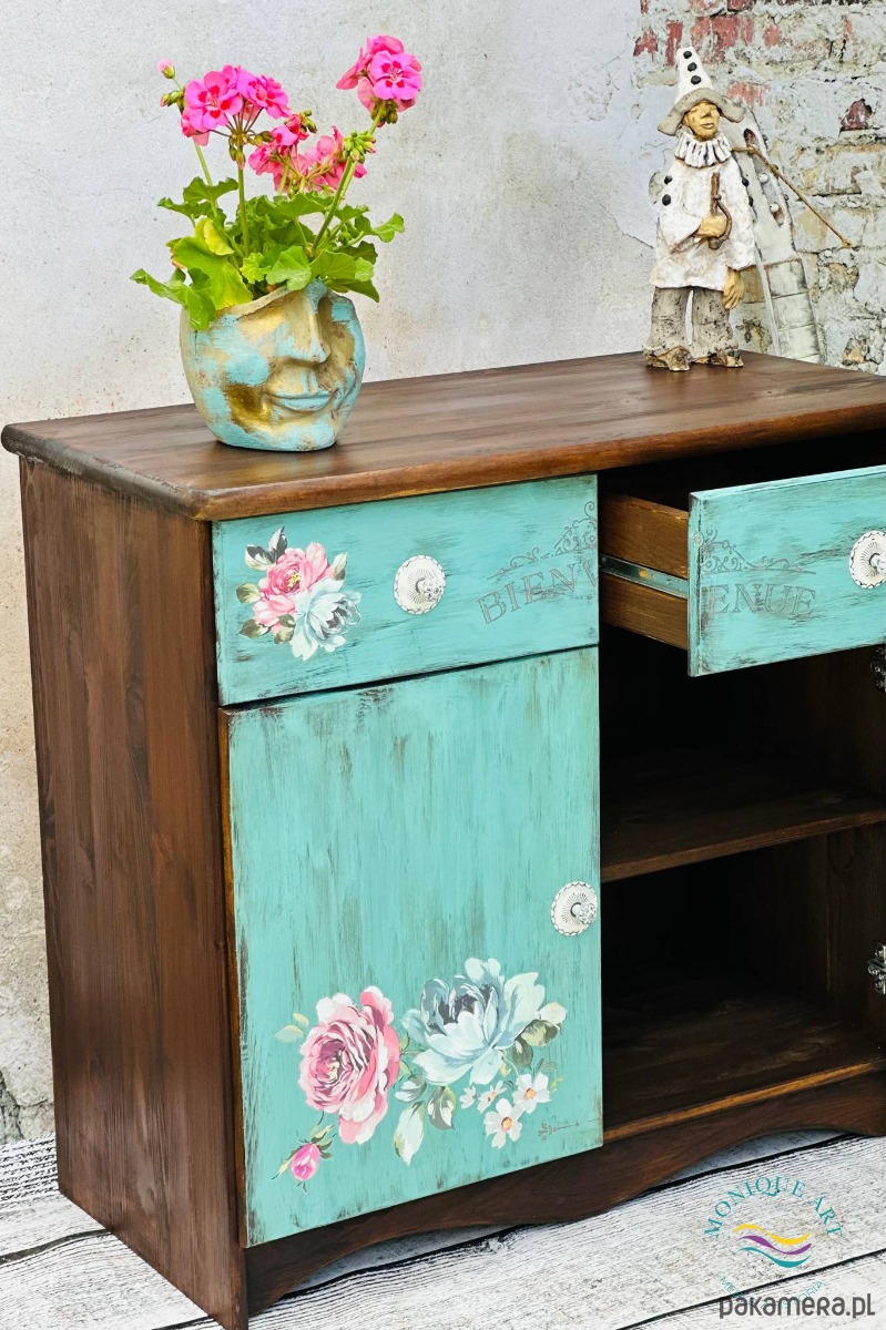Fronty komody ozdobione techniką shabby chic (przetarcia i niedomalowania są celowe) ozdobione kwiatami i napisami, pomalowane kolorem Provence (turkus) z palety farb kredowych Annie Sloan. Korpus, szafka i szuflady wewnątrz pomalowane bejcą w kolorze brązu. Całość zabezpieczona lakierem.