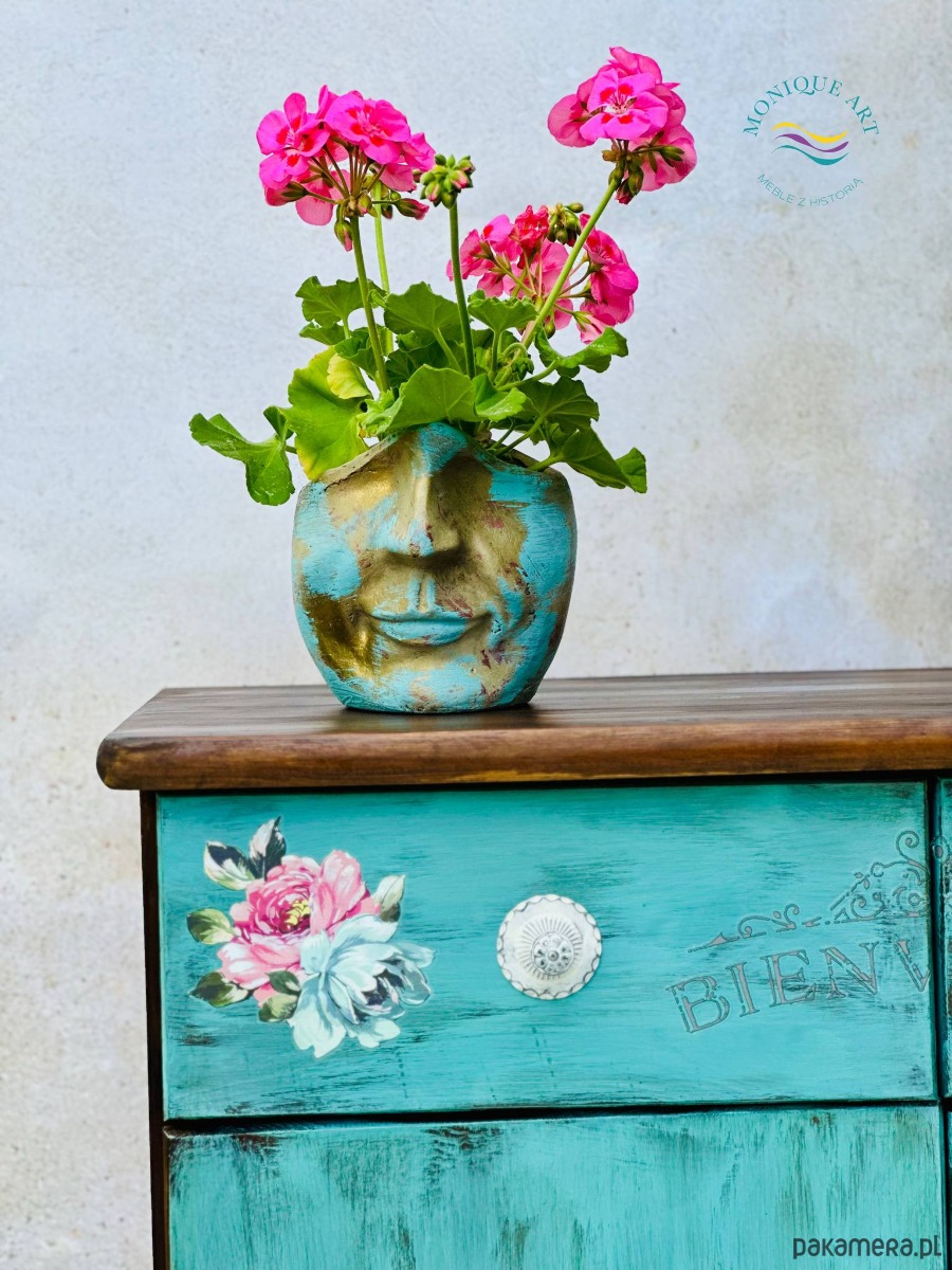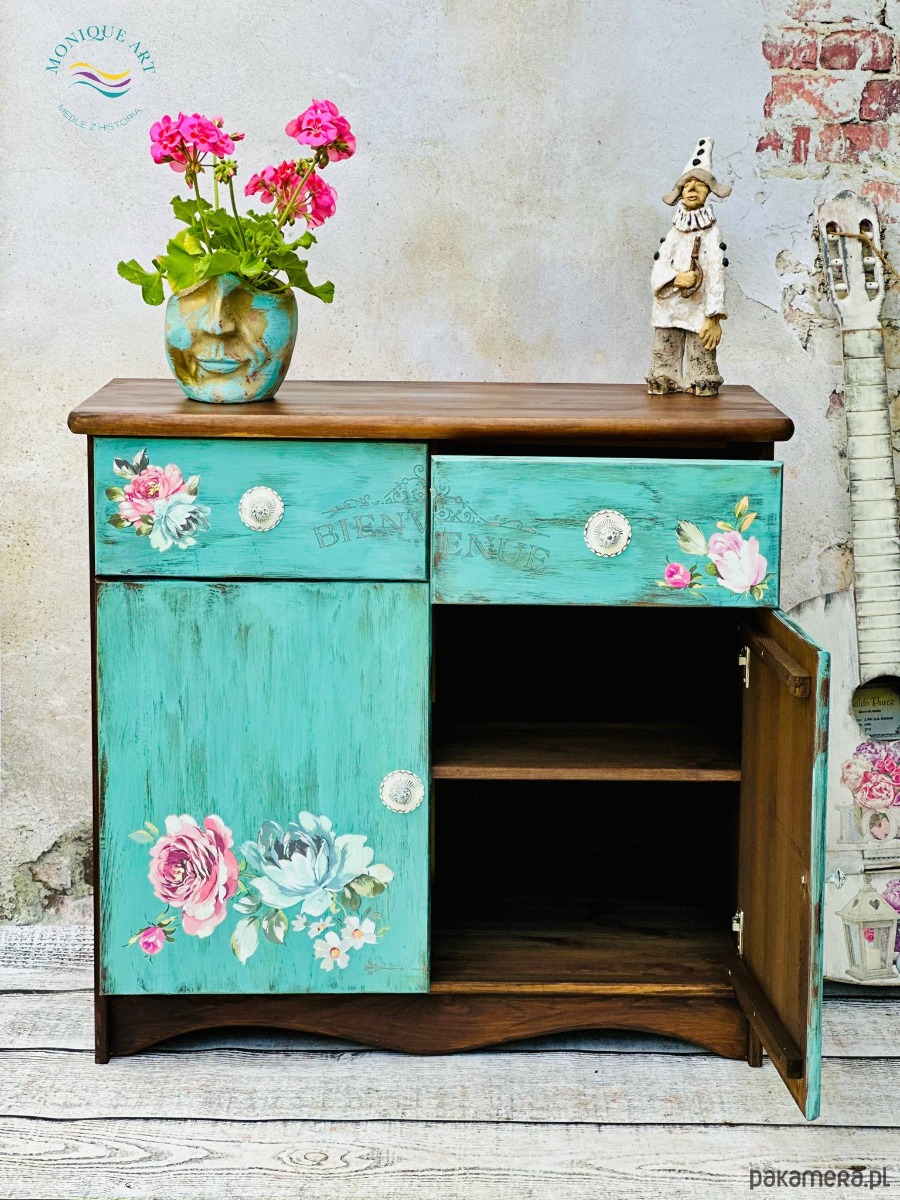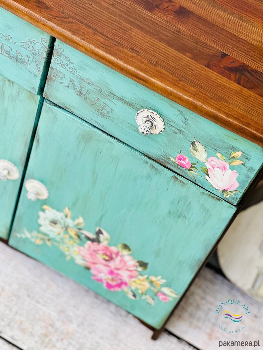 Fronty komody ozdobione techniką shabby chic (przetarcia i niedomalowania są celowe) ozdobione kwiatami i napisami, pomalowane kolorem Provence (turkus) z palety farb kredowych Annie Sloan. Korpus, szafka i szuflady wewnątrz pomalowane bejcą w kolorze brązu. Całość zabezpieczona lakierem.