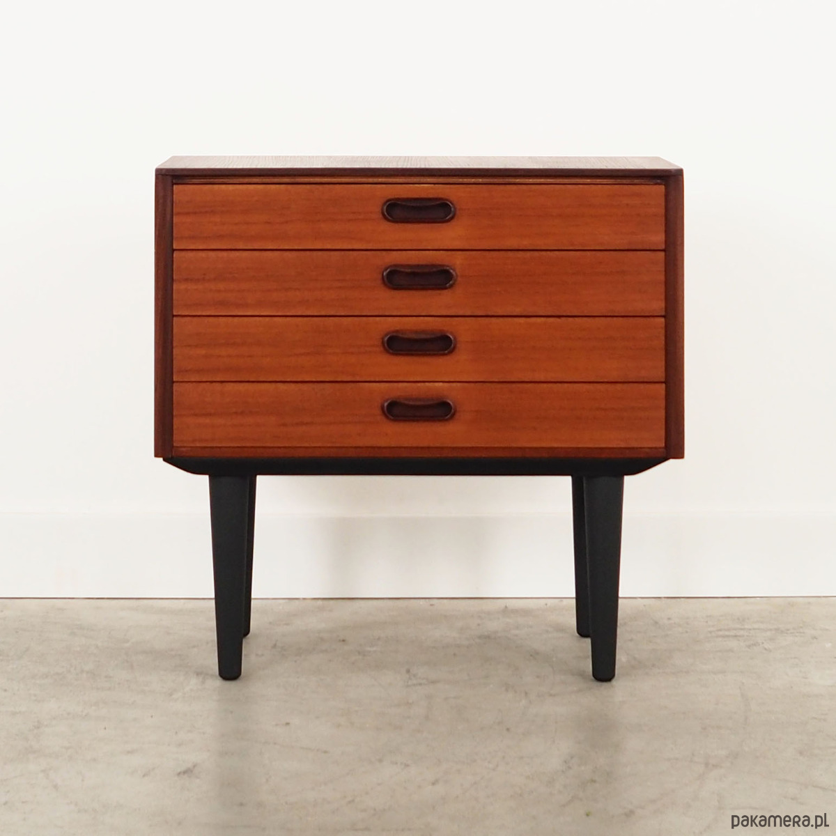 Konstrukcja pokryta jest fornirem tekowym. Nogi wykonane z litego drewna wybarwionego na kolor czarny. Powierzchnia po odświeżeniu. Komoda to klasyczna szufladówka idealna do każdej przestrzeni. Dzięki czterem szufladom spełni idealnie swoją rolę jako szafka na dokumenty, zabawki w pokoju dziecięcym lub jako bieliźniarka w sypialni.