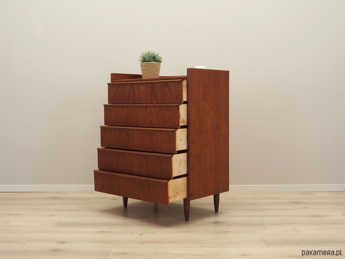 Konstrukcja pokryta jest fornirem tekowym. Nogi zostały wykonane z litego drewna. Powierzchnia po odświeżeniu. Komoda to klasyczna szufladówka idealna do każdej przestrzeni. Dzięki pięciu pojemnym szufladom spełni idealnie swoją rolę jako szafka na dokumenty, zabawki w pokoju dziecięcym lub jako bieliźniarka w sypialni. Brak klucza w zestawie.