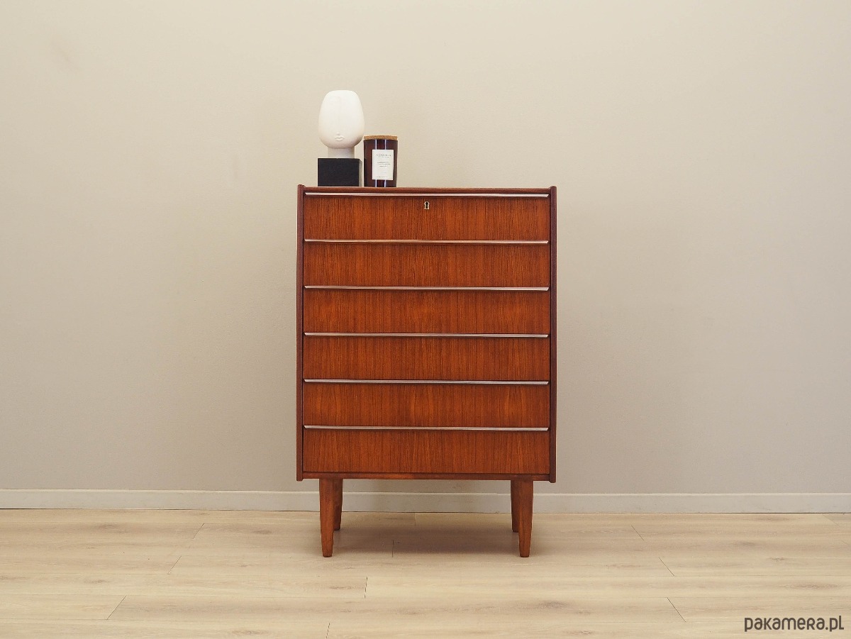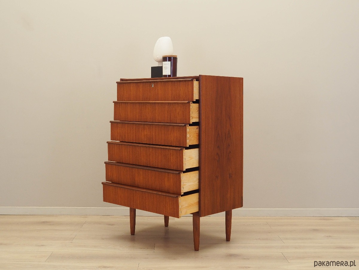 Konstrukcja pokryta jest fornirem tekowym. Nogi zostały wykonane z litego drewna. Powierzchnia po odświeżeniu. Komoda to klasyczna szufladówka idealna do każdej przestrzeni. Dzięki sześciu pojemnym szufladom spełni idealnie swoją rolę jako szafka na dokumenty, zabawki w pokoju dziecięcym lub jako bieliźniarka w sypialni. Brak klucza w zestawie.
