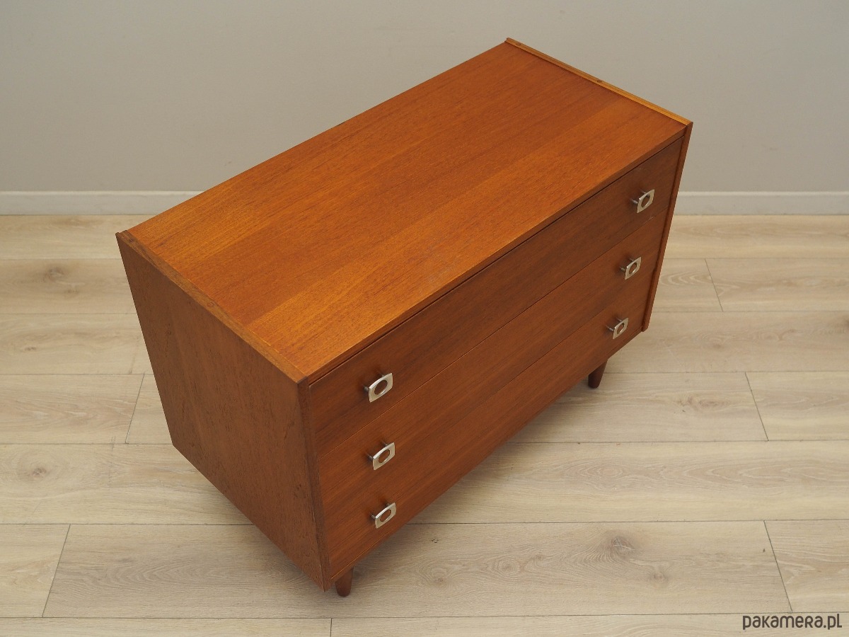 Konstrukcja pokryta jest fornirem tekowym. Nogi zostały wykonane z litego drewna. Powierzchnia po odświeżeniu. Komoda to klasyczna szufladówka idealna do każdej przestrzeni. Dzięki trzem pojemnym szufladom spełni idealnie swoją rolę jako szafka na dokumenty, zabawki w pokoju dziecięcym lub jako bieliźniarka w sypialni.