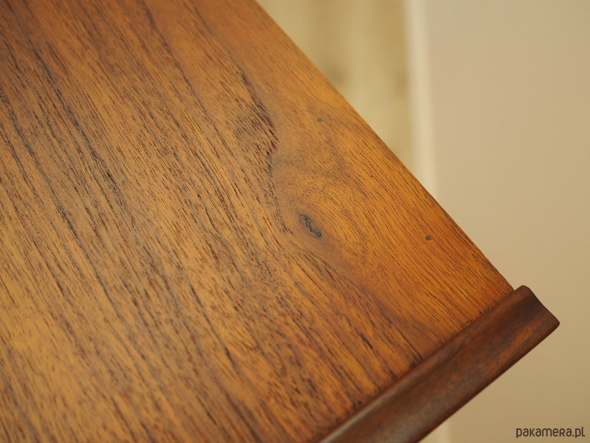 Konstrukcja pokryta jest fornirem tekowym. Nogi zostały wykonane z litego drewna. Powierzchnia po odświeżeniu. Komoda to klasyczna szufladówka idealna do każdej przestrzeni. Dzięki sześciu pojemnym szufladom spełni idealnie swoją rolę jako szafka na dokumenty, zabawki w pokoju dziecięcym lub jako bieliźniarka w sypialni. Brak klucza w zestawie.