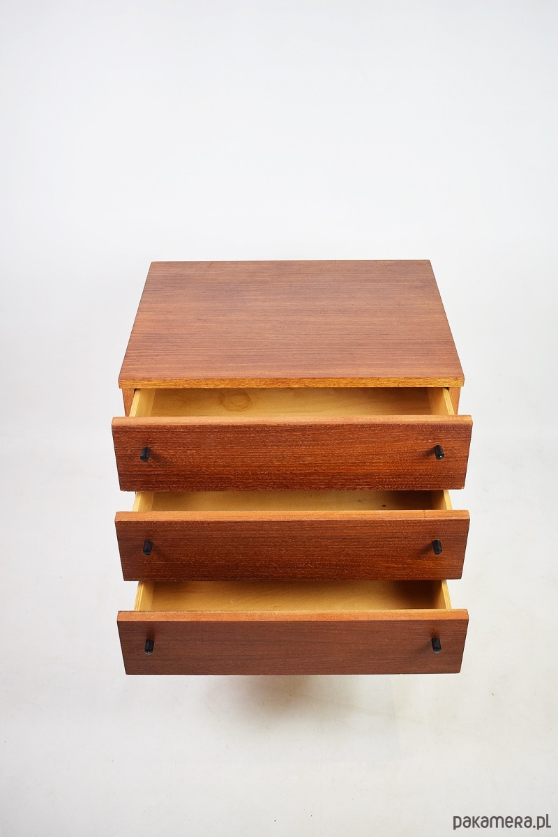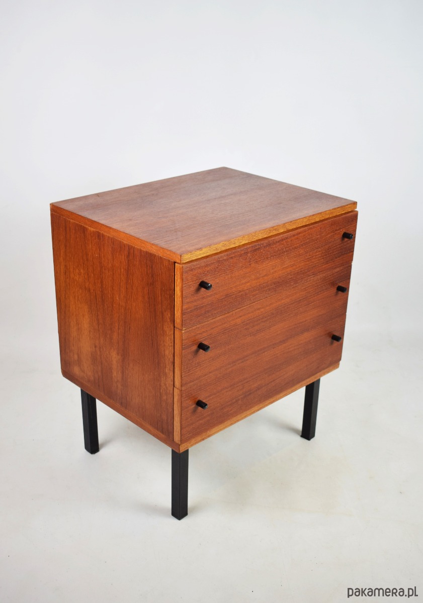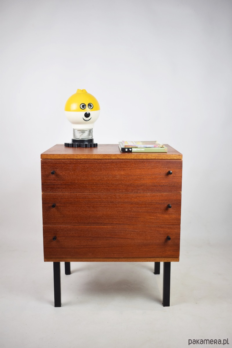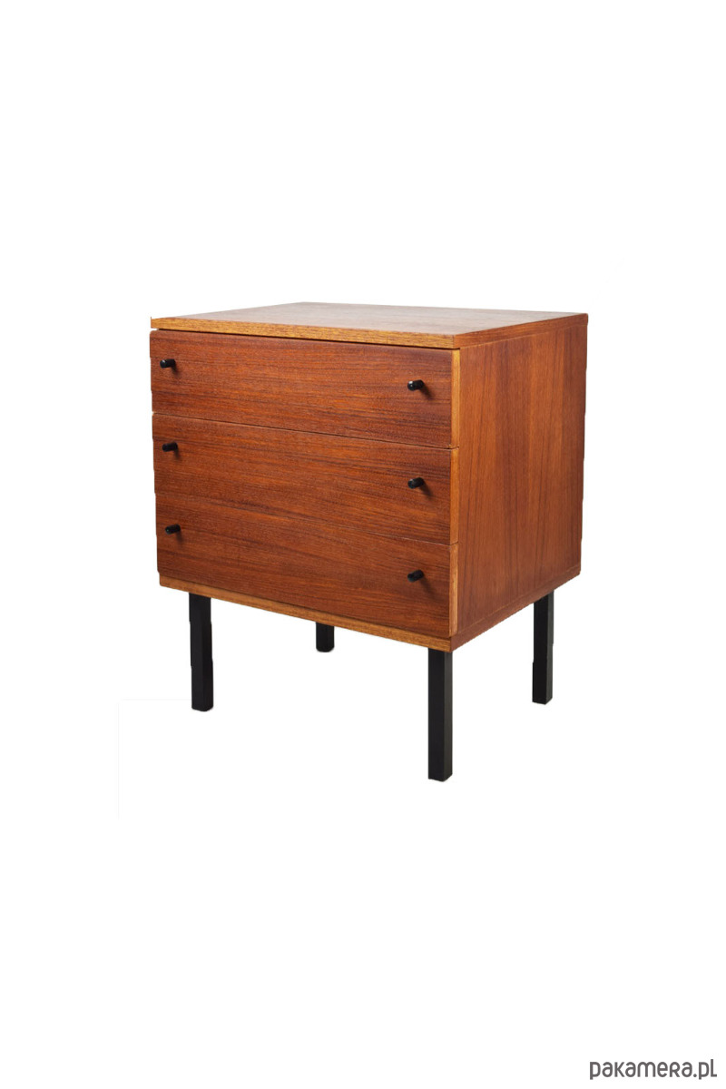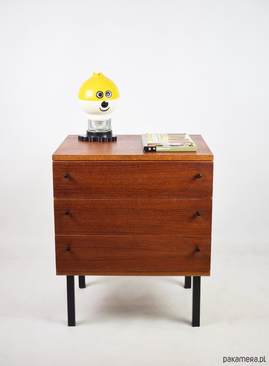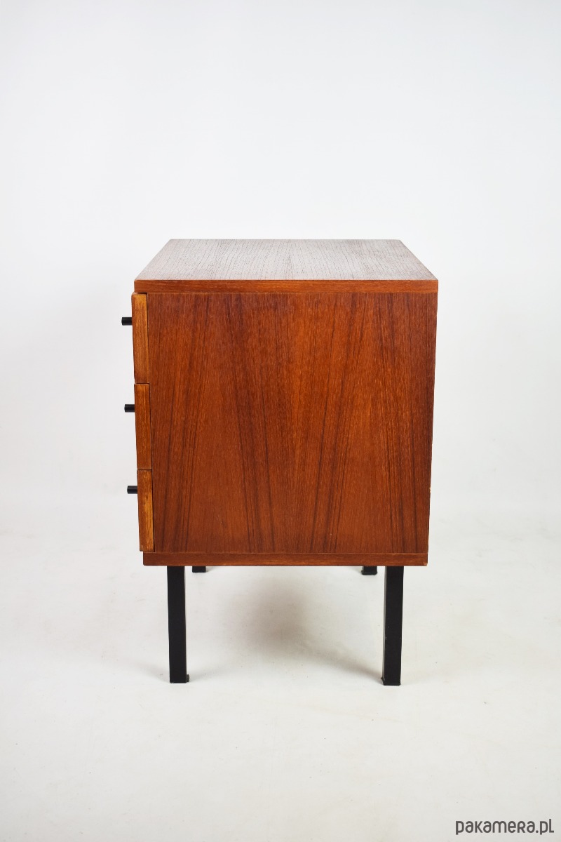 Stylowa komódka z lat 70. o charakterystycznej, modernistycznej formie. Mebel pokryty został naturalnym fornirem o ciepłym odcieniu drewna, który pięknie kontrastuje z metalowymi nogami o lekkiej, geometrycznej konstrukcji.