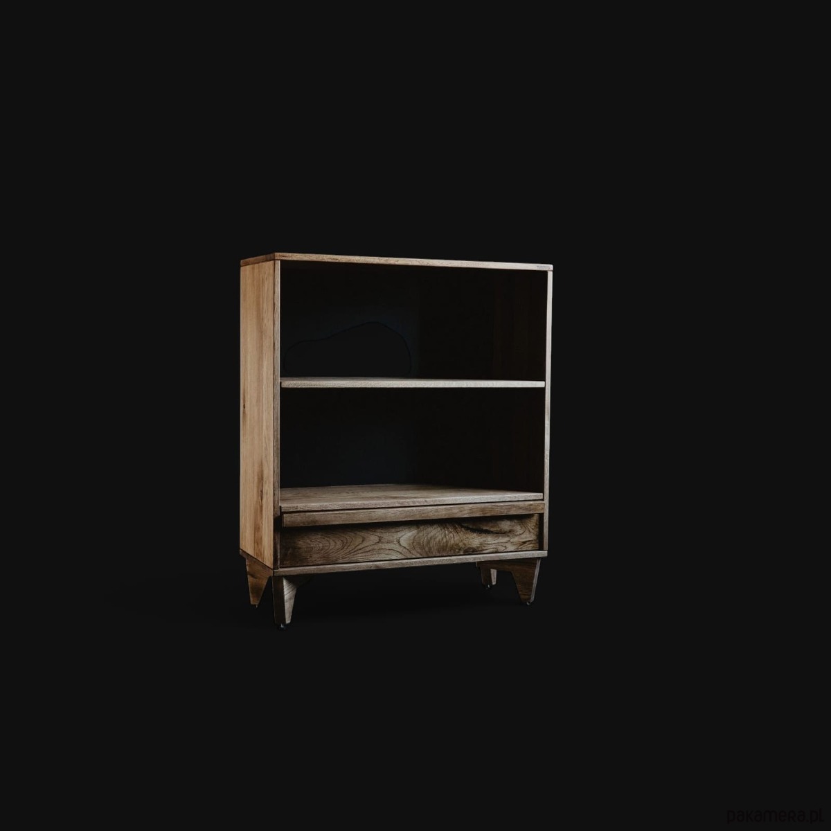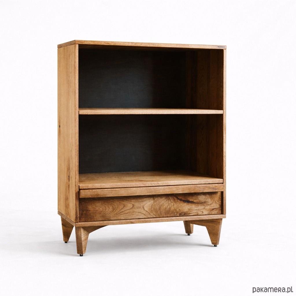 Wnętrze komody wyposażono w regulowaną półkę, umożliwiającą elastyczne dopasowanie przestrzeni do przechowywanych przedmiotów. Pojemna szuflada z drewnianym uchwytem zwiększa komfort codziennego użytkowania, zachowując spójność stylistyczną całej bryły.