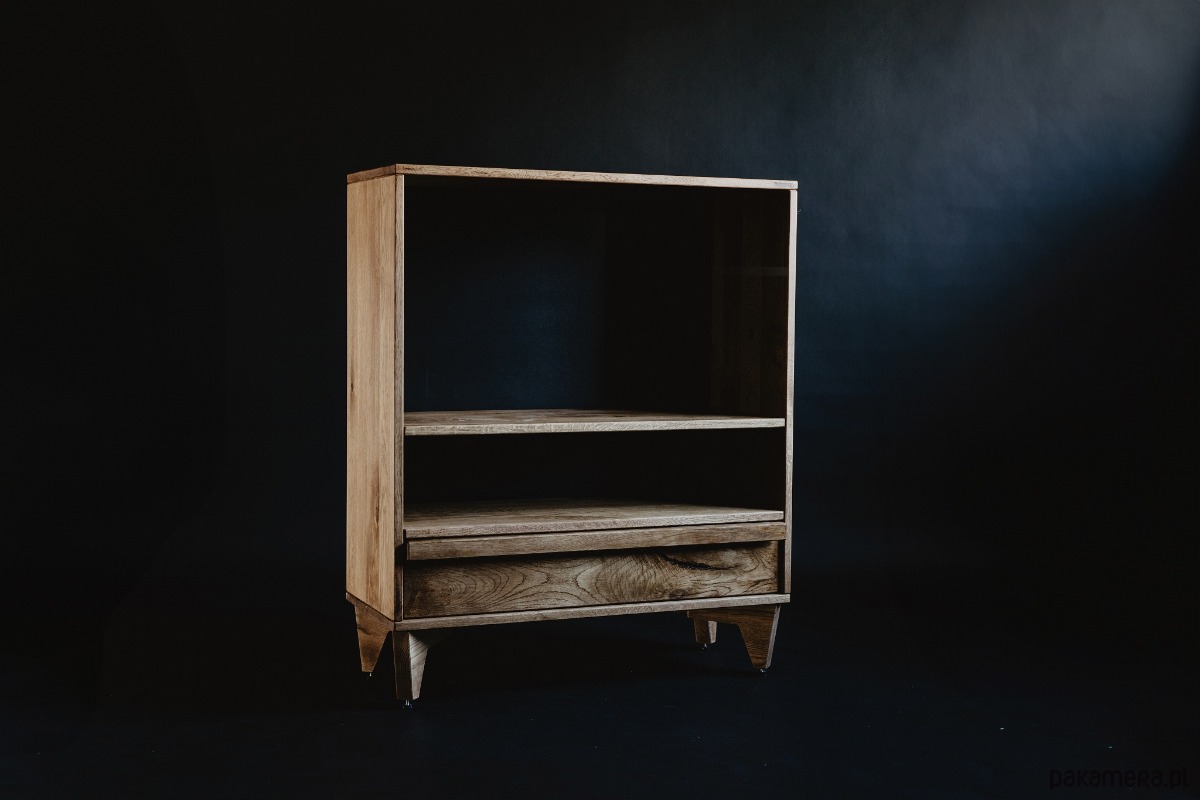 Wnętrze komody wyposażono w regulowaną półkę, umożliwiającą elastyczne dopasowanie przestrzeni do przechowywanych przedmiotów. Pojemna szuflada z drewnianym uchwytem zwiększa komfort codziennego użytkowania, zachowując spójność stylistyczną z całą bryłą mebla.