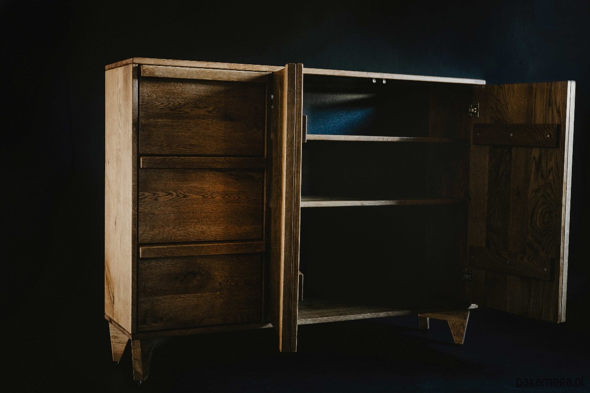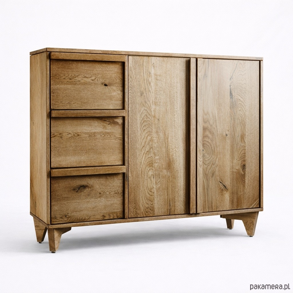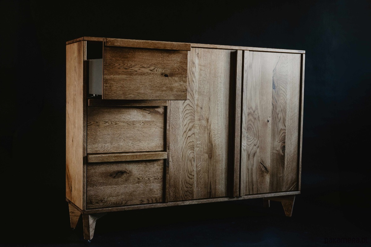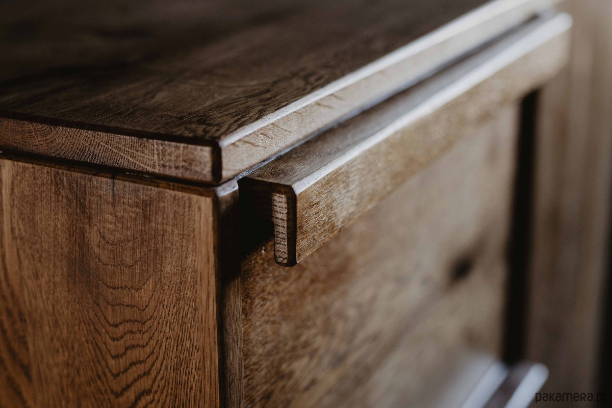 Komoda z szufladami K3 łączy lite drewno dębowe z minimalistyczną, elegancką formą. Fronty oraz korpus zostały zabezpieczone ekologicznym olejowoskiem, który podkreśla naturalne usłojenie drewna, jednocześnie ułatwiając pielęgnację i zwiększając odporność powierzchni na codzienne użytkowanie.