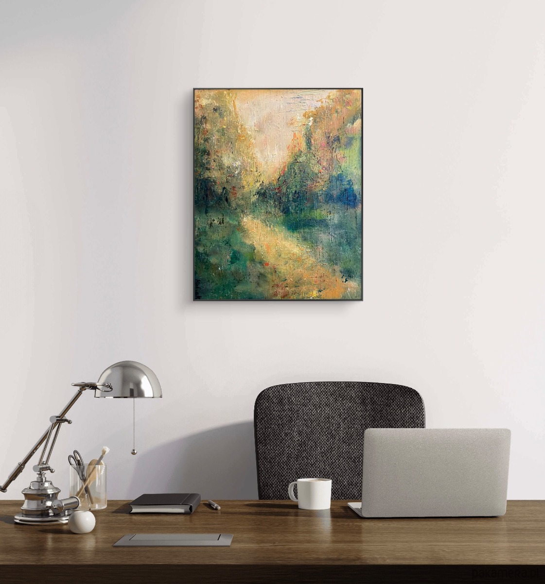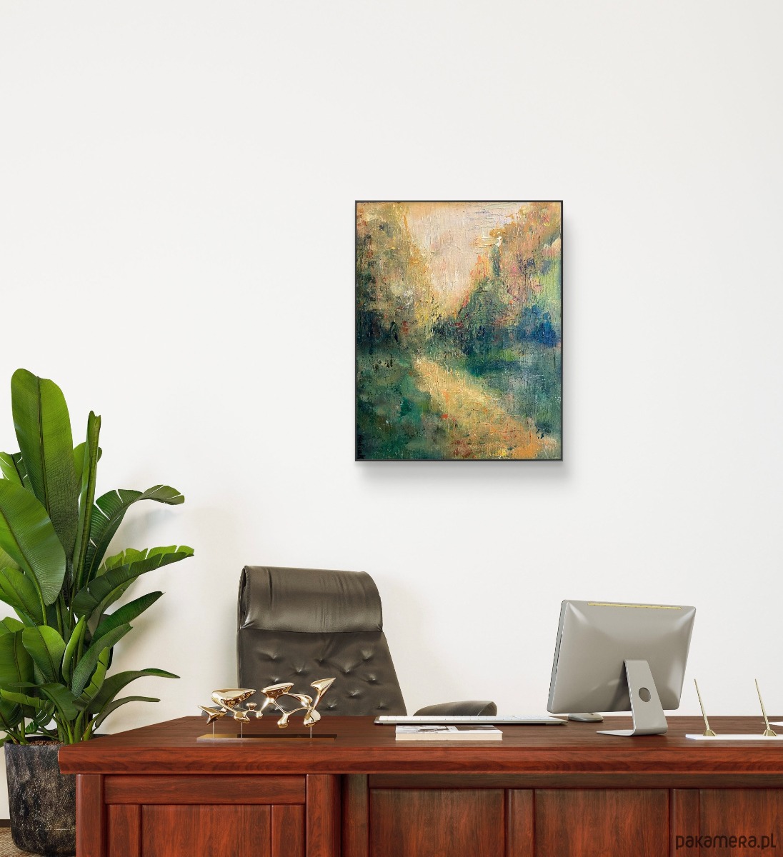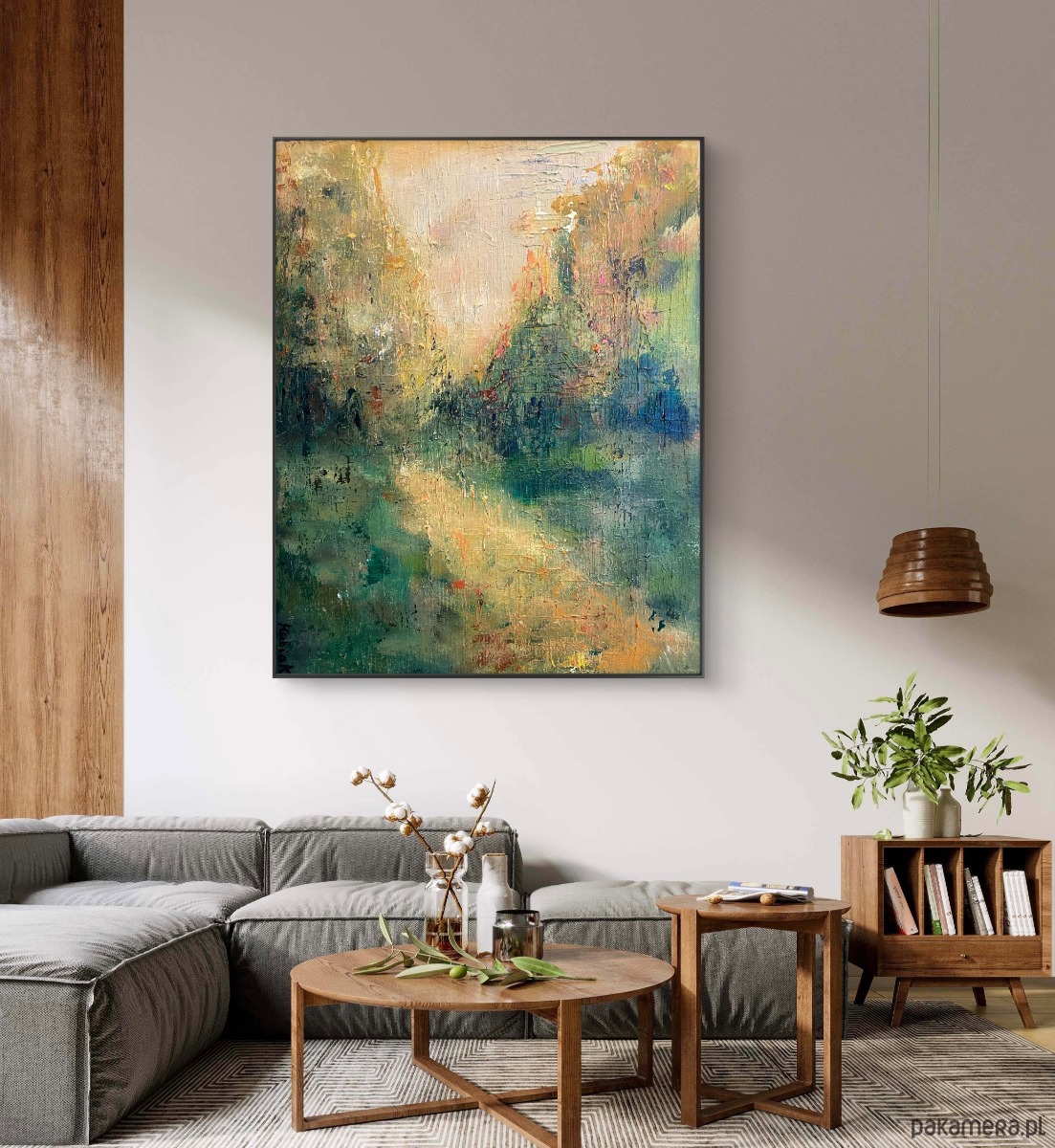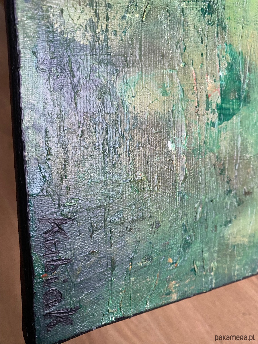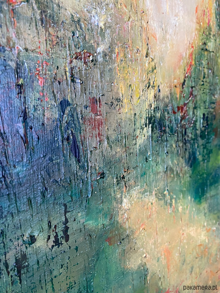 Technika: farby akrylowe na płótnie, werniks, impast, pędzel, szpachla, gąbka