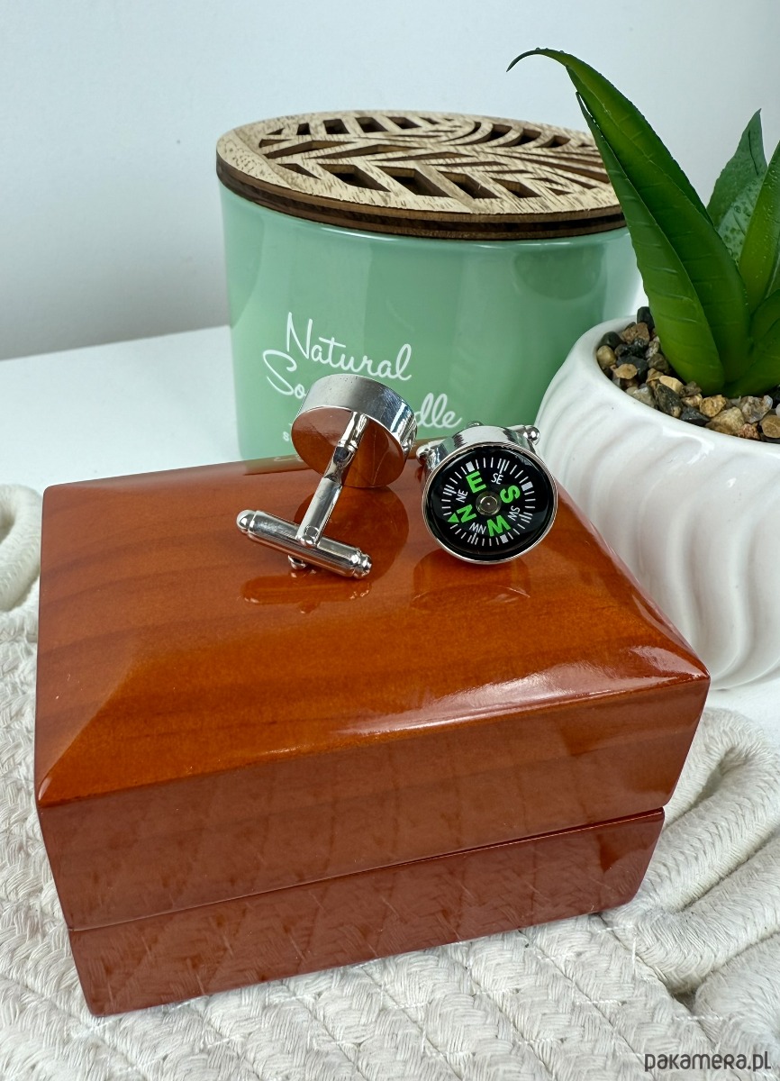 Spinki zapakowane w drewniane pudełko wykończone na wysoki połysk