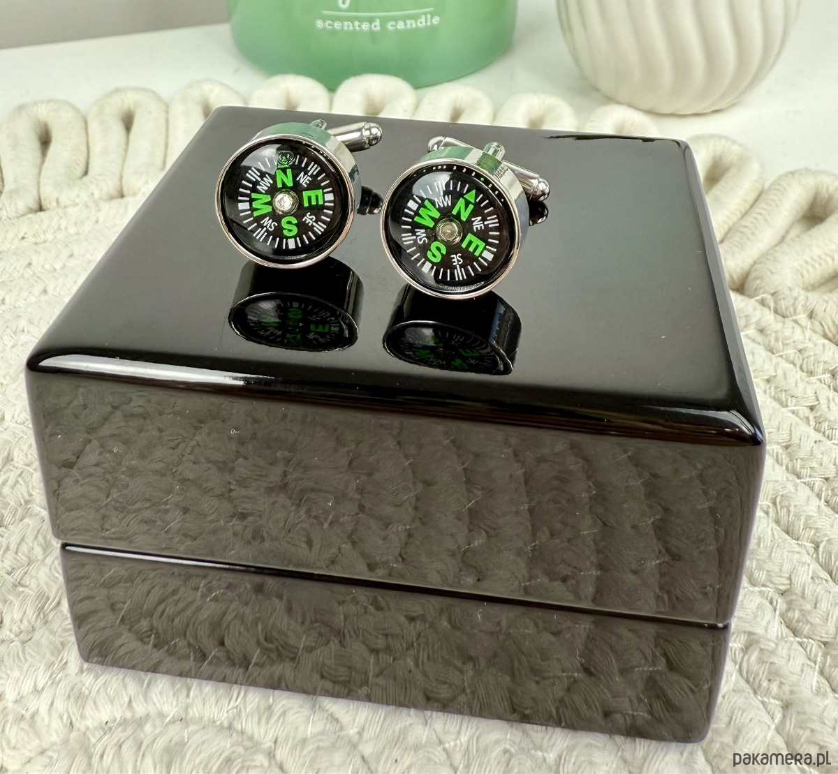 Spinki zapakowane w drewniane pudełko wykończone na wysoki połysk