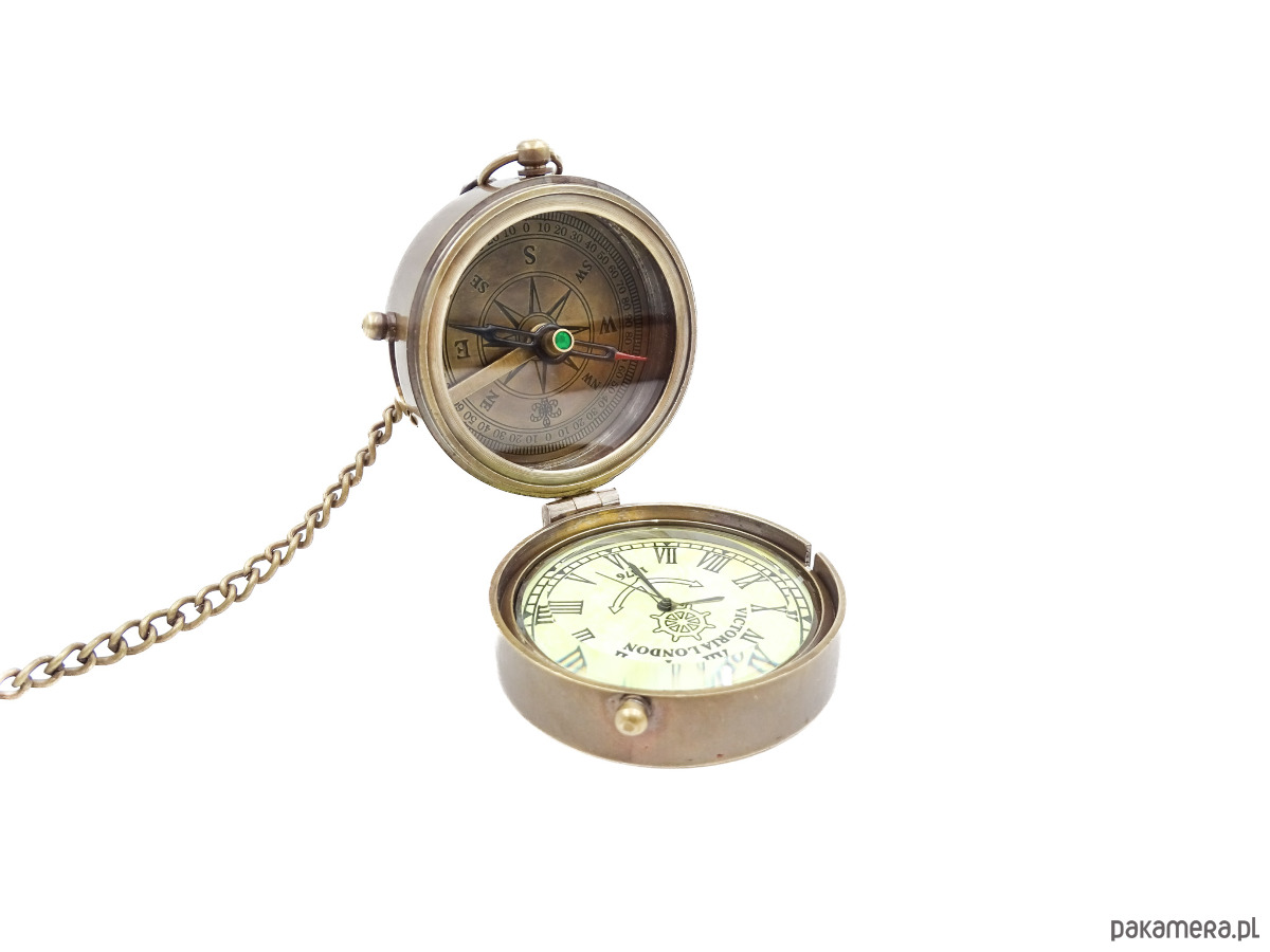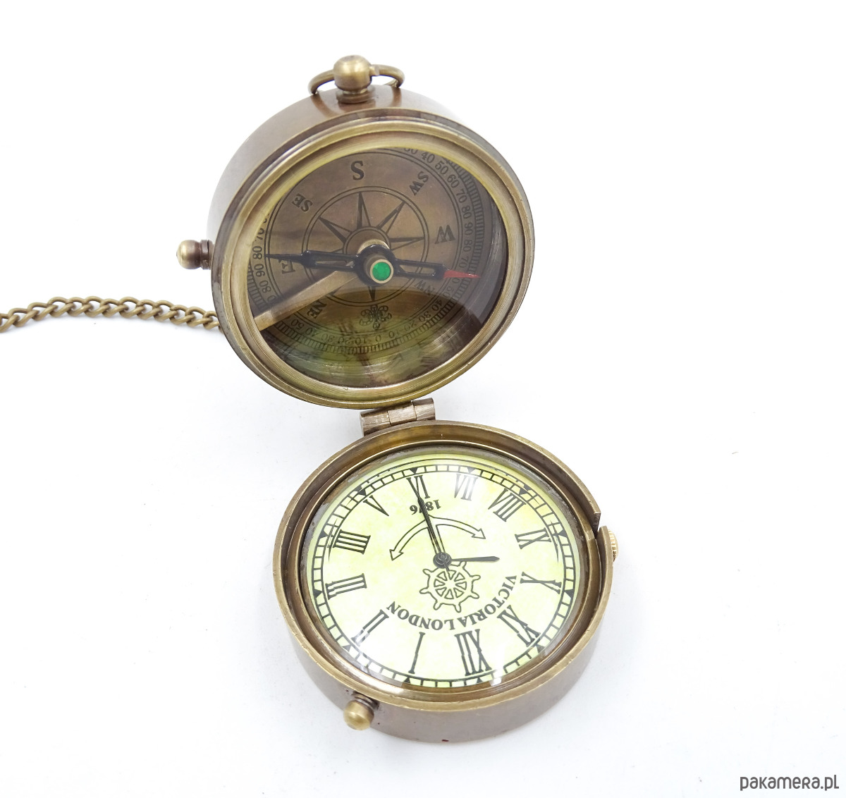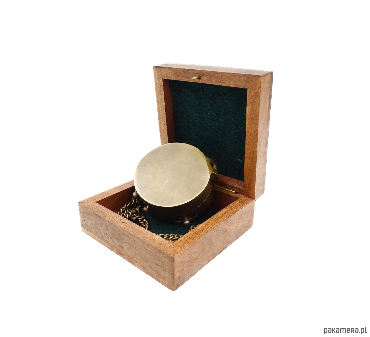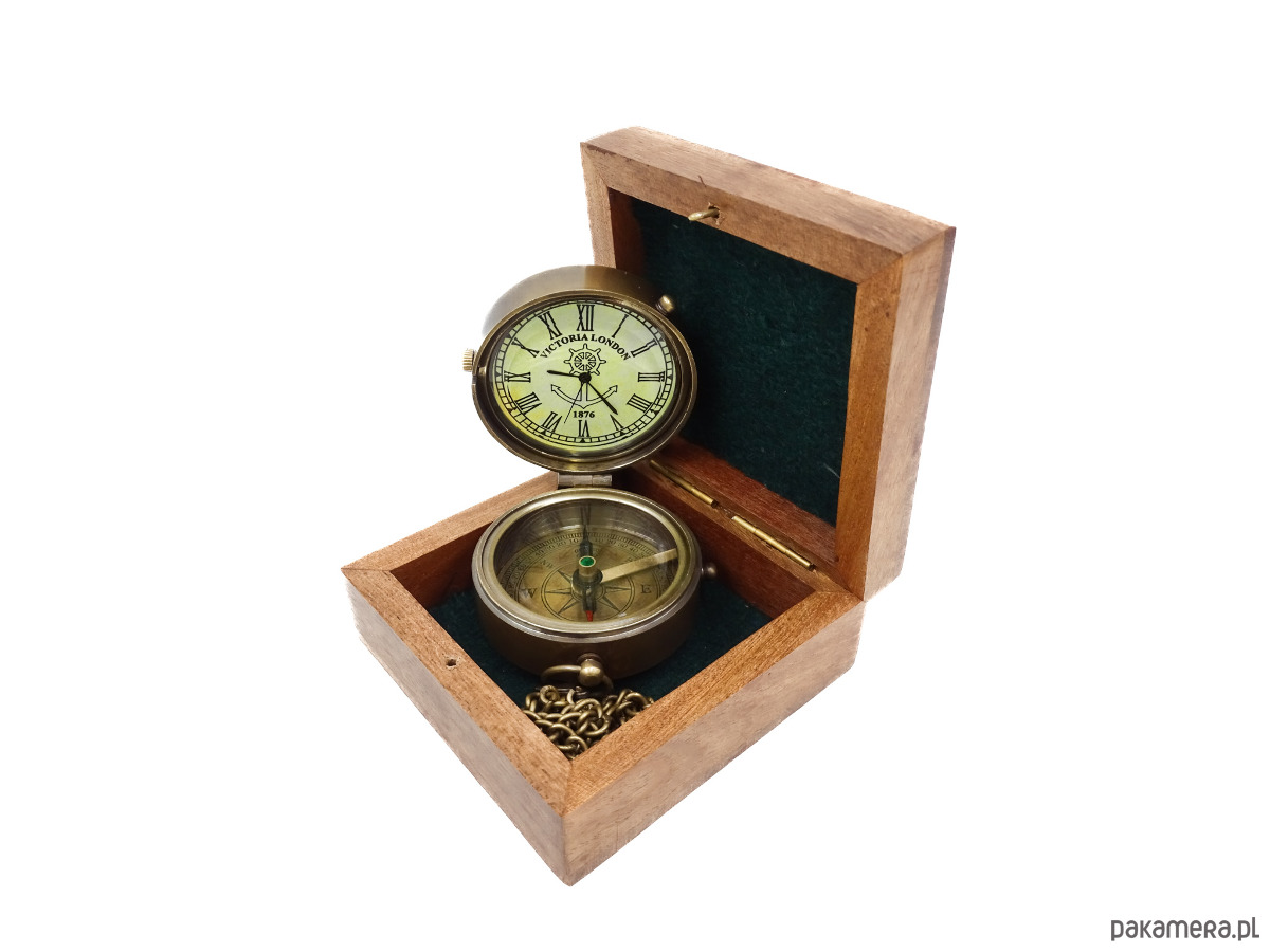 Kompas z zegarkiem mosiężnym w pudełku drewnianym, sprawdzi się jako: