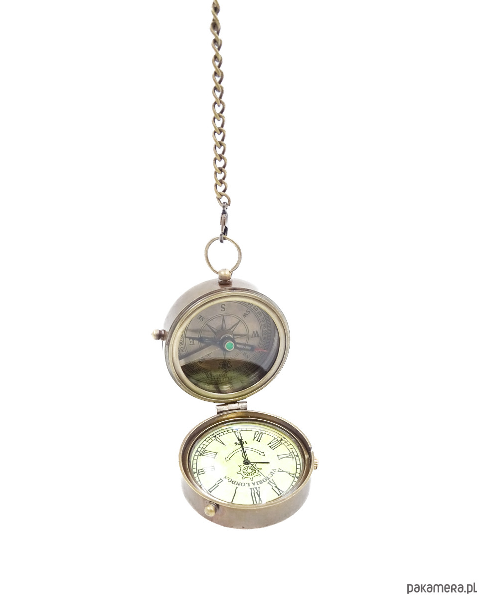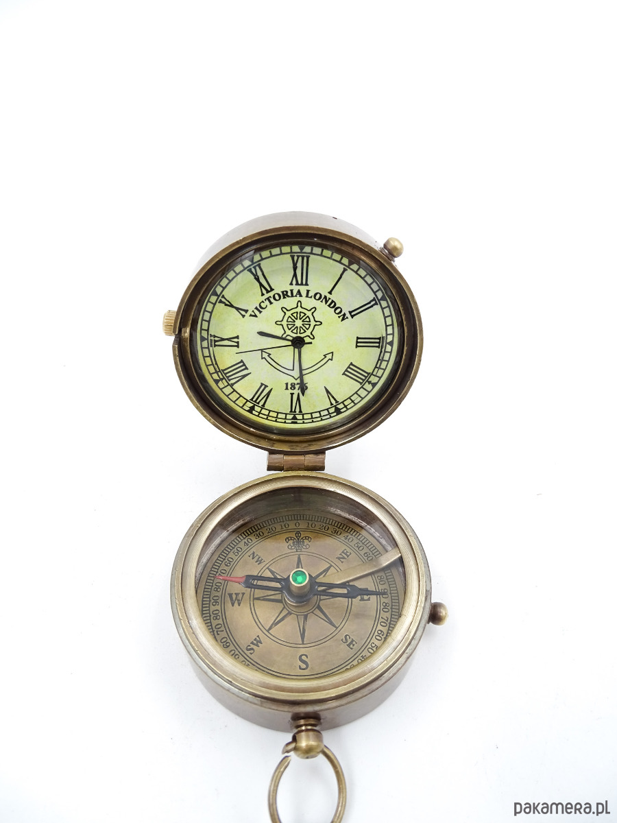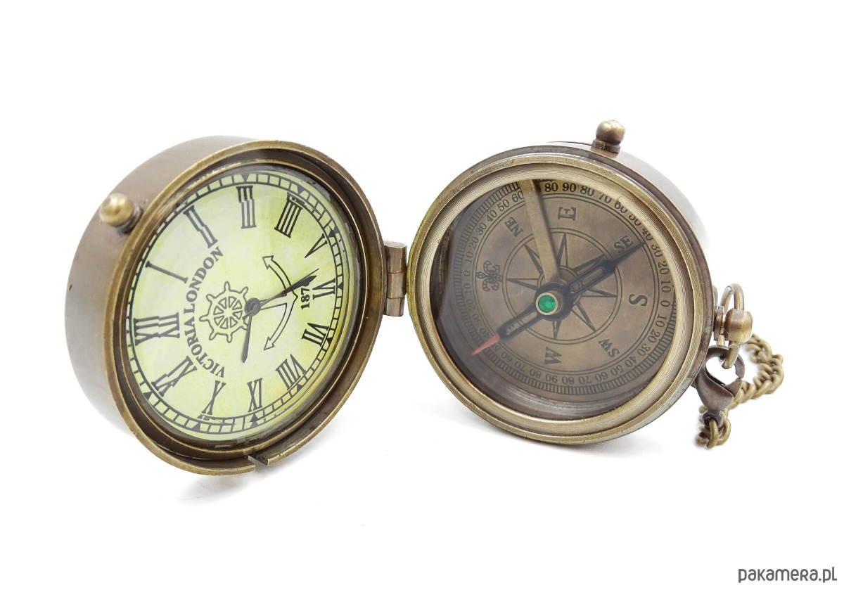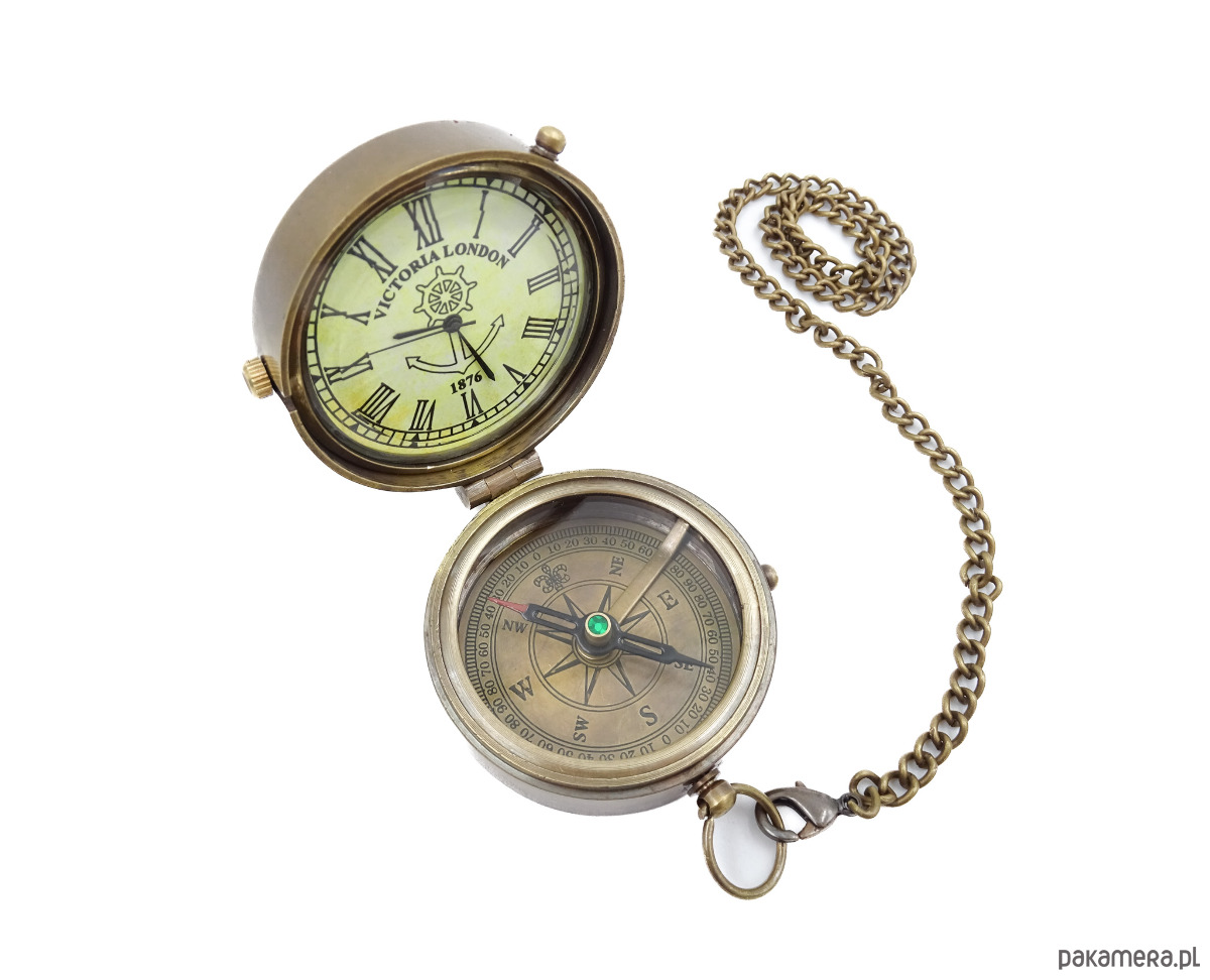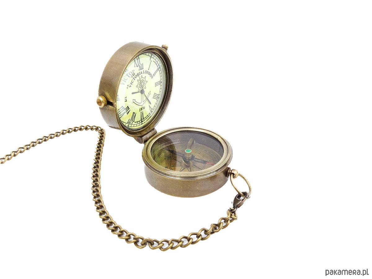 Kompas z zegarkiem mosiężnym w pudełku drewnianym, sprawdzi się jako: