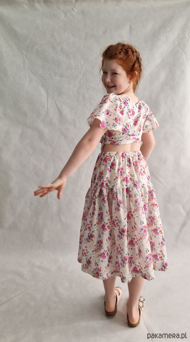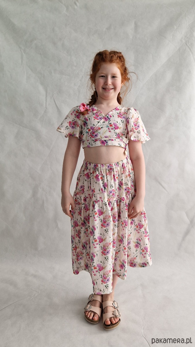 Komplecik uszyty jest z bardzo cienkiej bawełny voile w kolorze kremowym w kwiaty. Ten komplecik będzie idealny na lato, jest bardzo przewiewny. Ponadto spodniczkę i bluzkę można nosić osobno, co daje wiele możliwości stylizacji ubranka. Tkanina z której uszyty jest komplet jest bardzo miła i delikatna, dzięki czemu ubranie jest bardzo wygodne.
