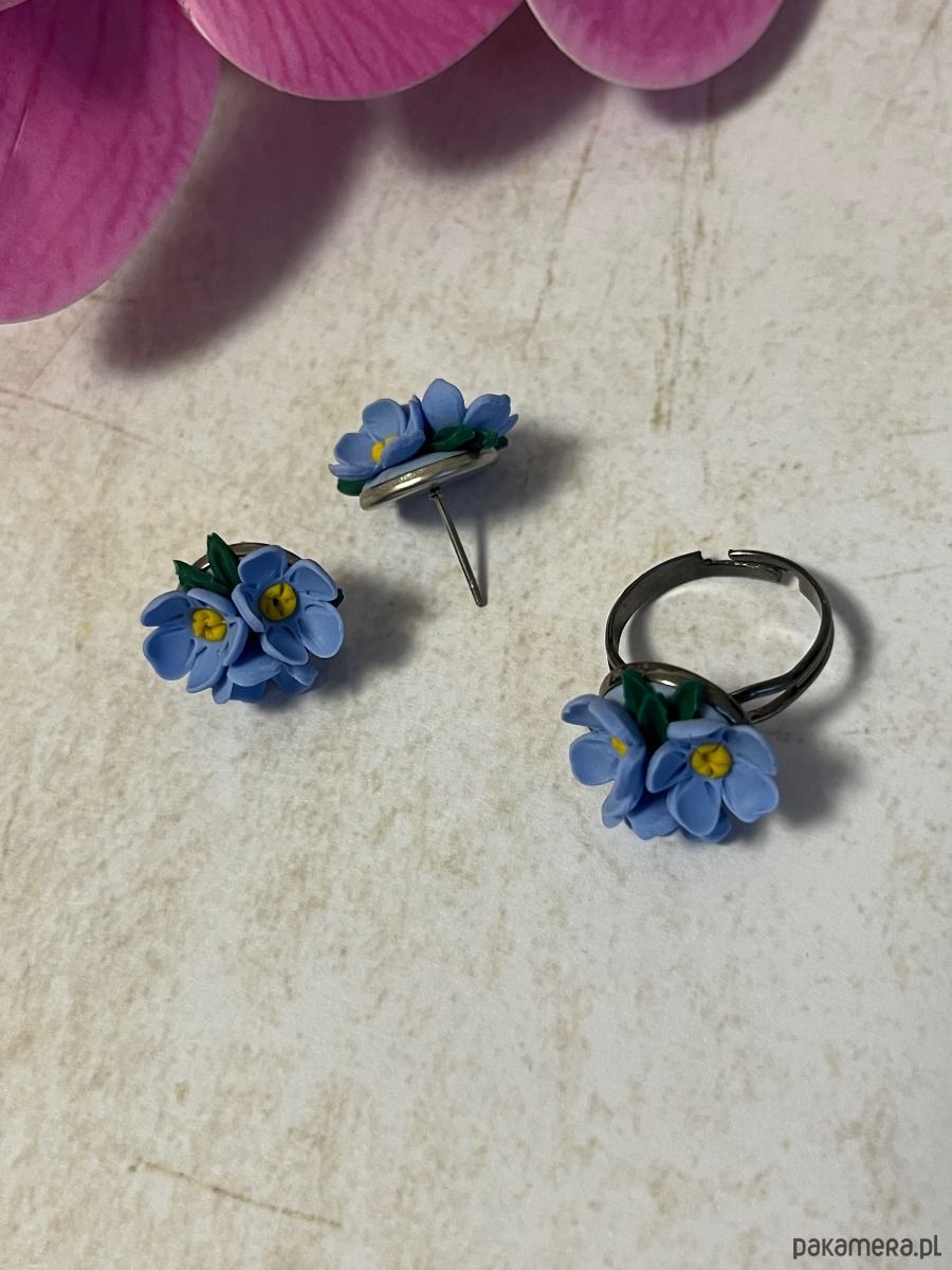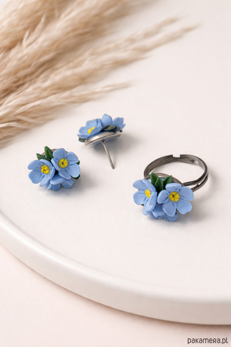 Komplet biżuterii z niezapominajkami – kolczyki i pierścionek