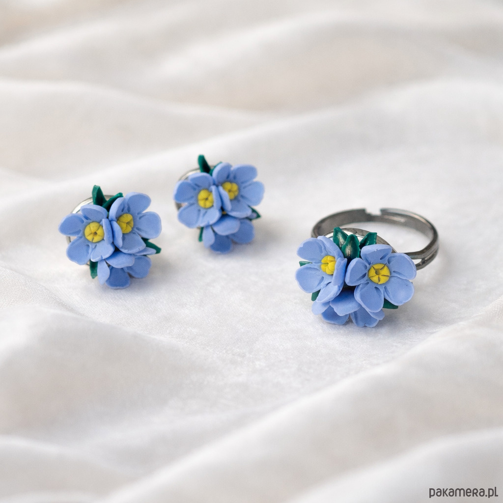 Delikatny, ręcznie wykonany komplet biżuterii z drobnymi, niebieskimi kwiatami przypominającymi niezapominajki. Każdy element został starannie uformowany z modeliny, z dbałością o najmniejsze detale – żółte środki kwiatów oraz zielone listki nadają całości naturalnego uroku.