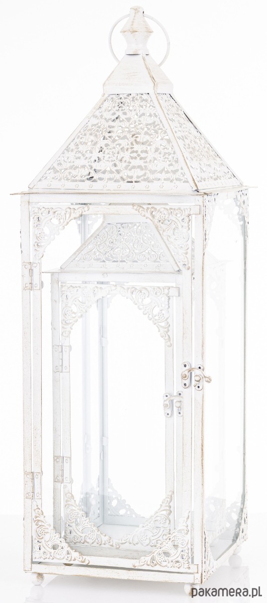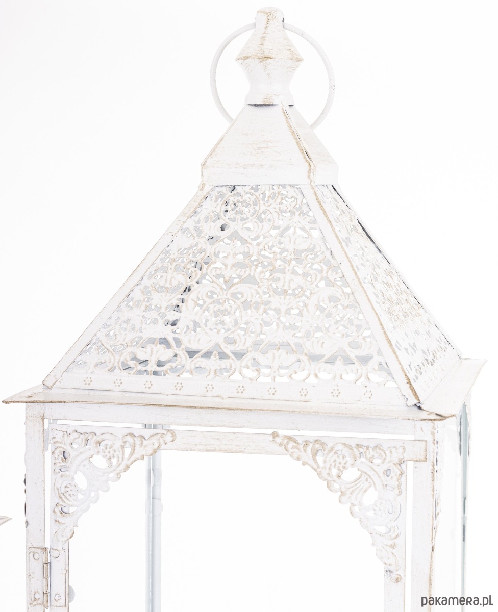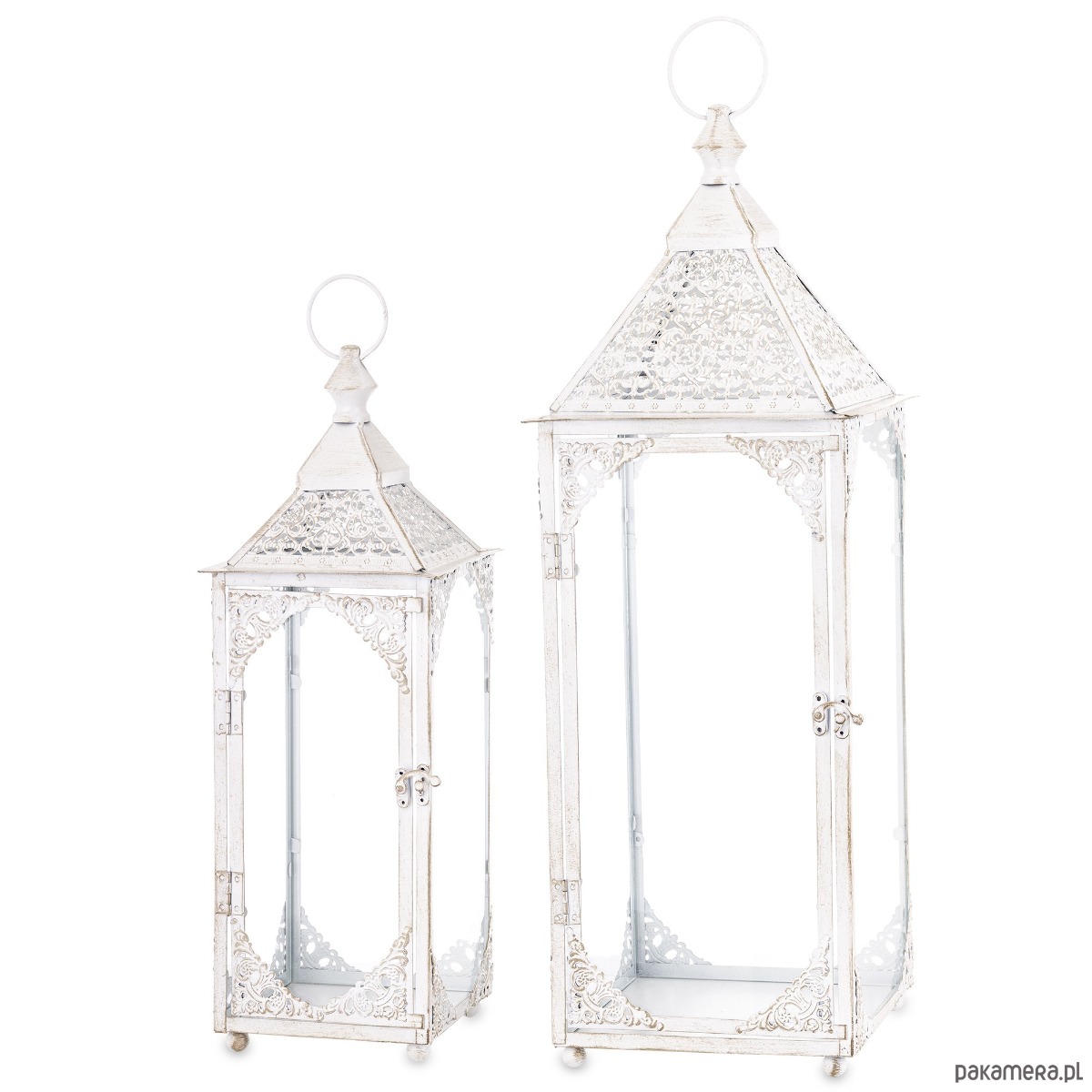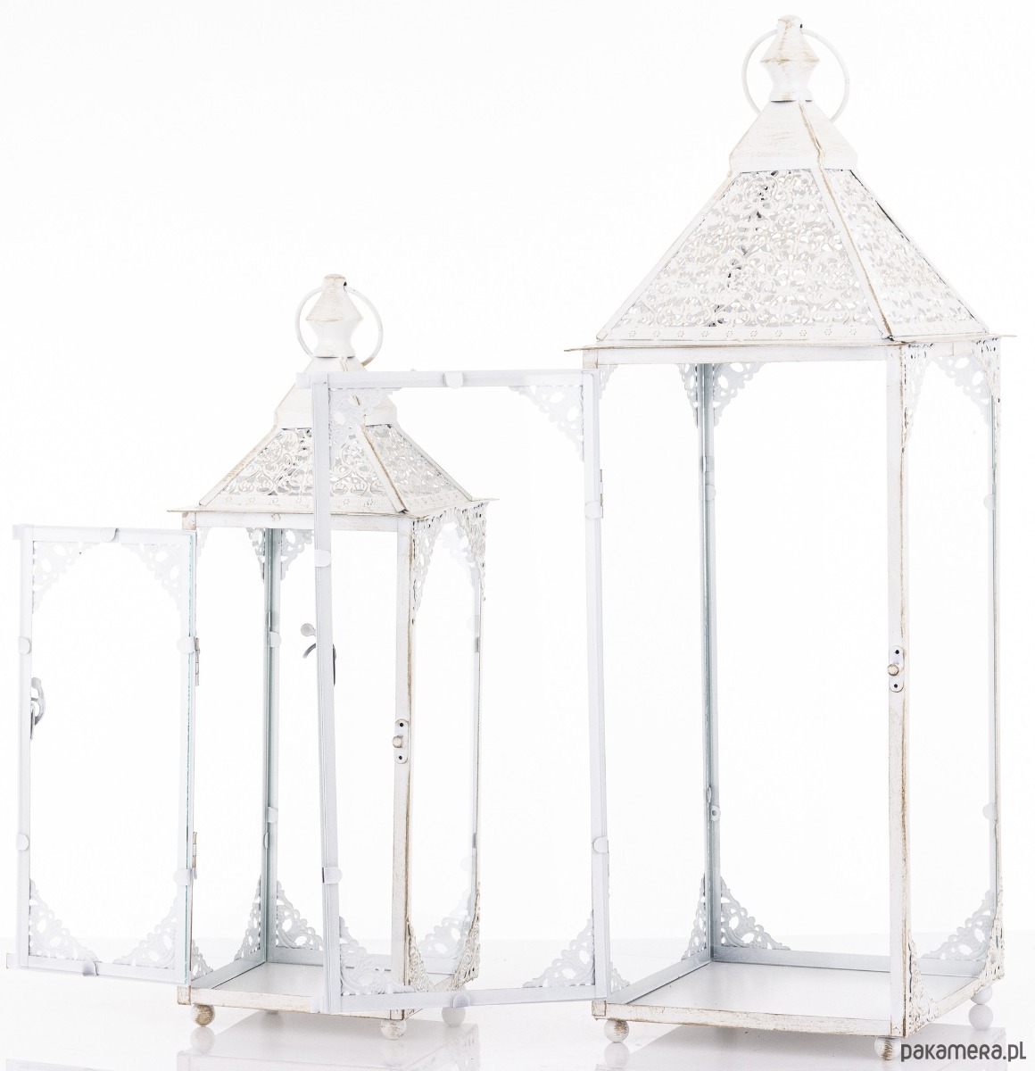 Komplet dwóch lampionów. Są duże i przepiękne. Mają prostą, nowoczesną formę z ażurowymi kopułkami. Całość wykonana jest z metalu w białym kolorze. Boki są szklane. Stworzą intymną atmosferę w pomieszczeniu.