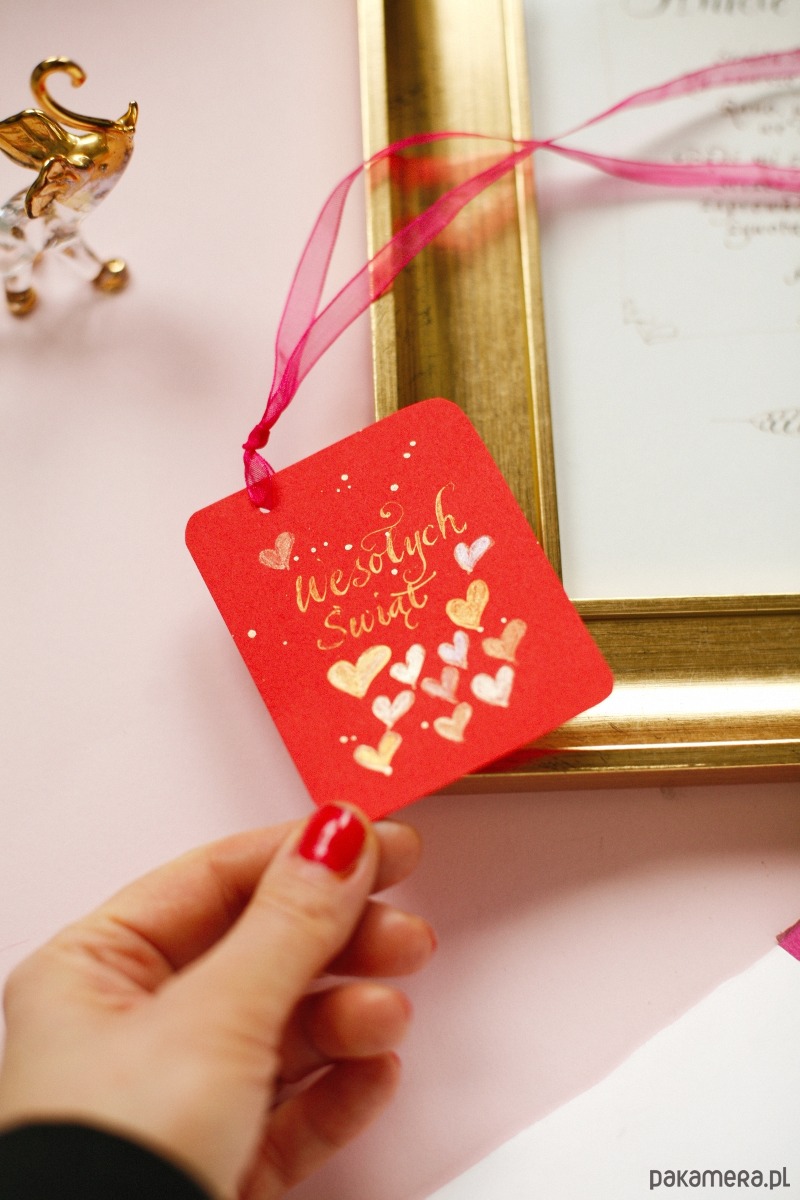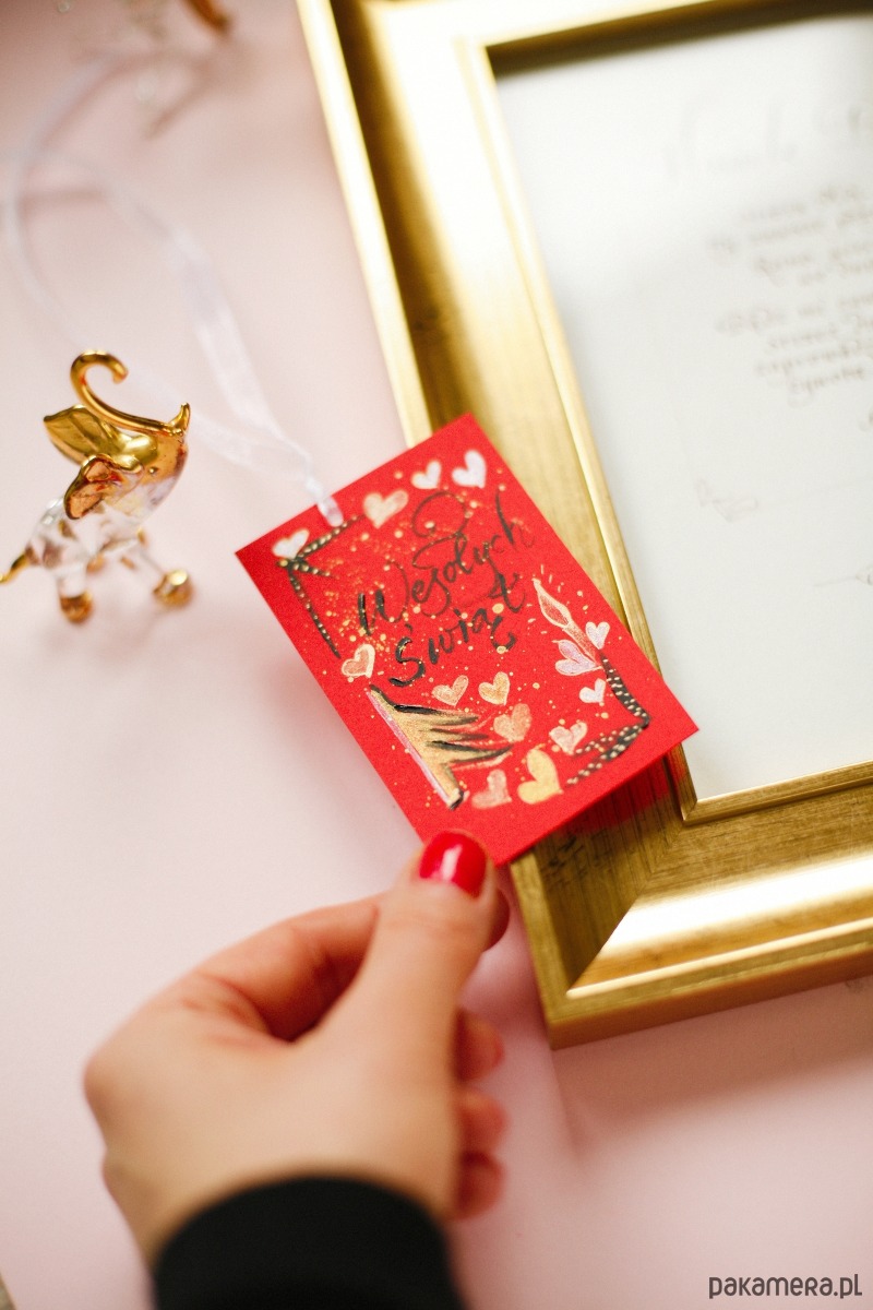 Zestaw trzech bilecików świątecznych z kaligrafowanym ręcznie napisem "Wesołych Świąt" ozdobionym złotymi serduszkami. Pomysł na wyjątkowy dodatek do prezentu i uszczęśliwienie bliskich osób :)