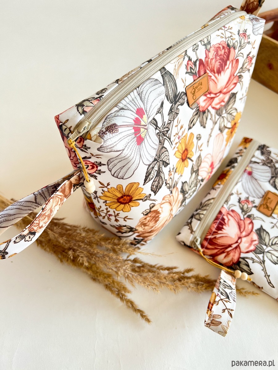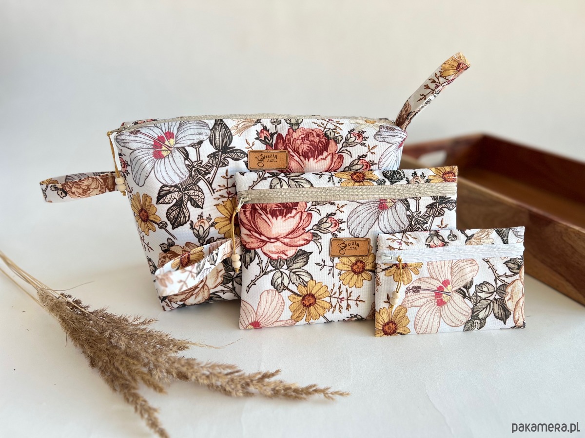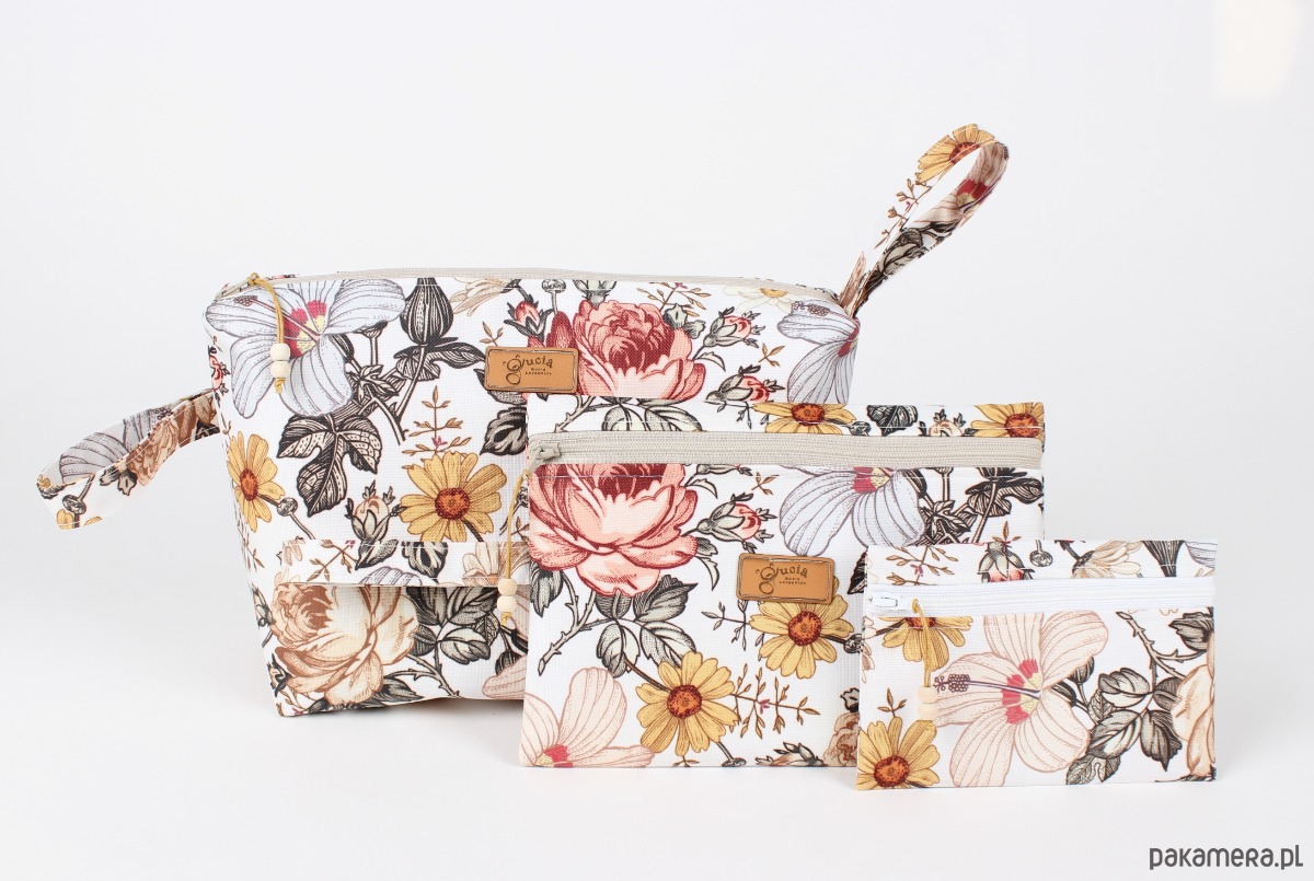 Komplet 3 kosmetyczek wodoodpornych. Duża i średnia z wodoodporną podszewką i pętelkami do zawieszenia np. na haczyk. Usztywnione.Do największej mieści się reszta.