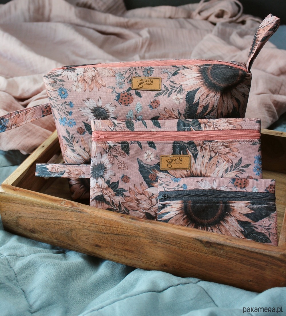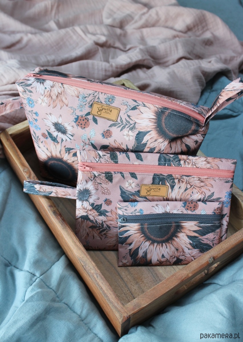 Komplet 3 kosmetyczek wodoodpornych w przepiękny kwiatowy wzór. Usztywnione. Do największej mieści się reszta.