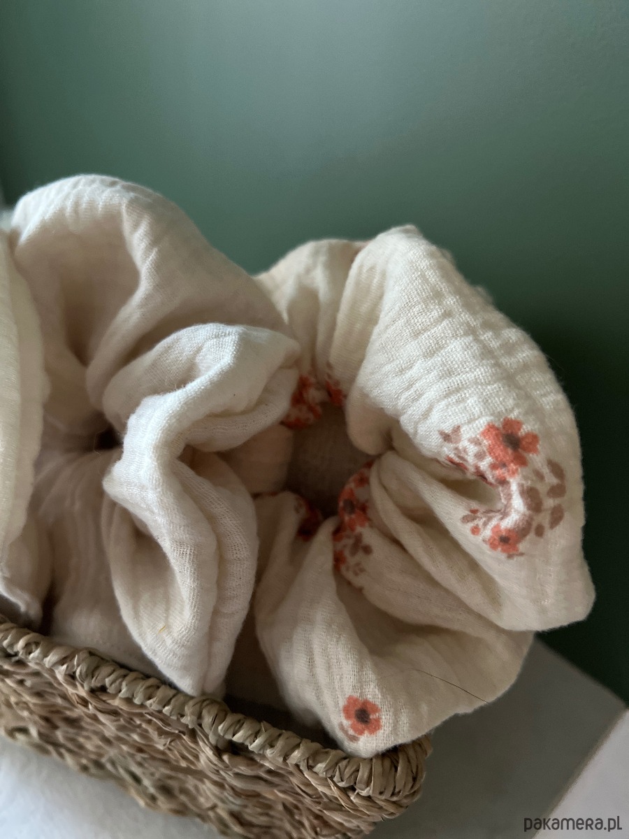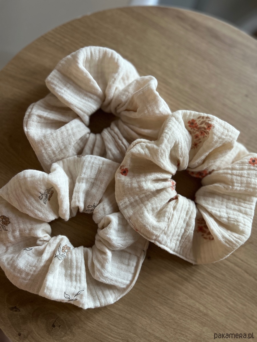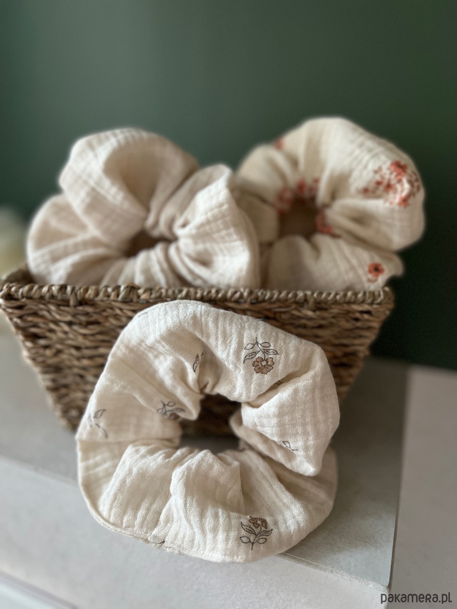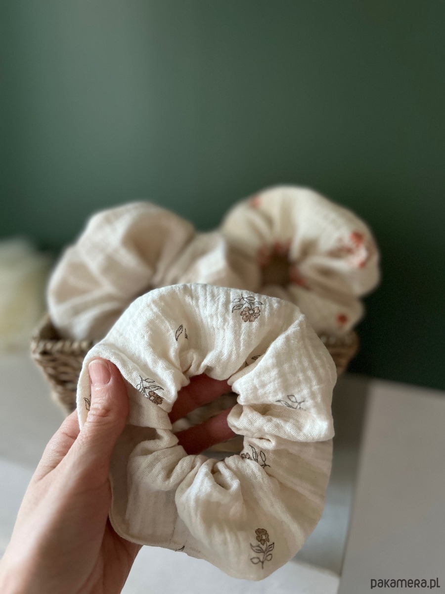 Scrunchie są wykonane z naturalnej, oddychającej tkaniny, przyjemnej w dotyku i idealnej na cały rok — szczególnie na cieplejsze dni. Dobrze trzymają włosy, a jednocześnie nie powodują dyskomfortu nawet przy dłuższym noszeniu.