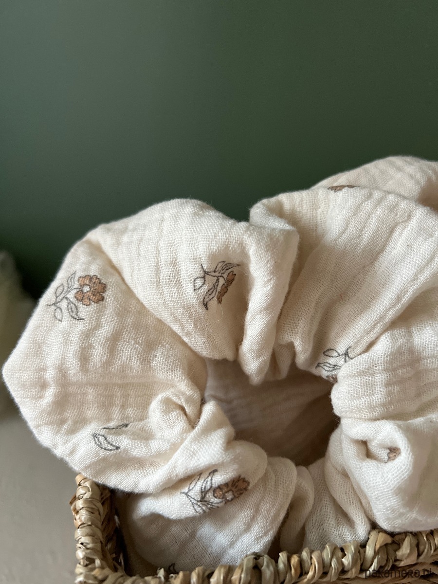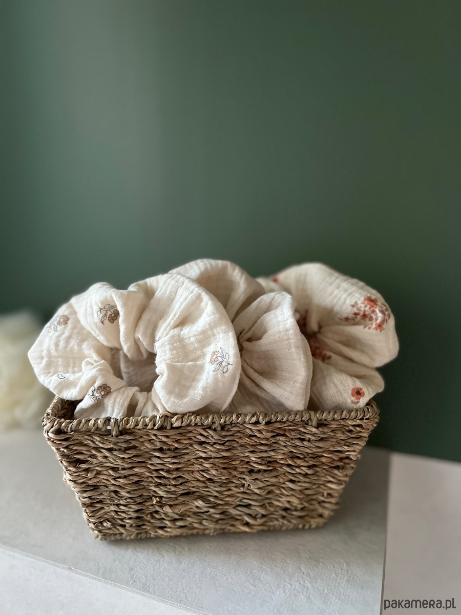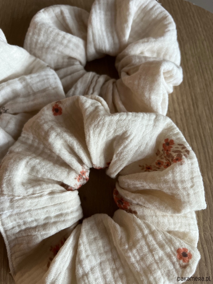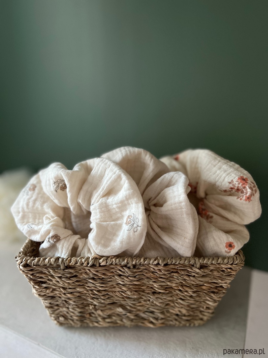 Scrunchie są wykonane z naturalnej, oddychającej tkaniny, przyjemnej w dotyku i idealnej na cały rok — szczególnie na cieplejsze dni. Dobrze trzymają włosy, a jednocześnie nie powodują dyskomfortu nawet przy dłuższym noszeniu.