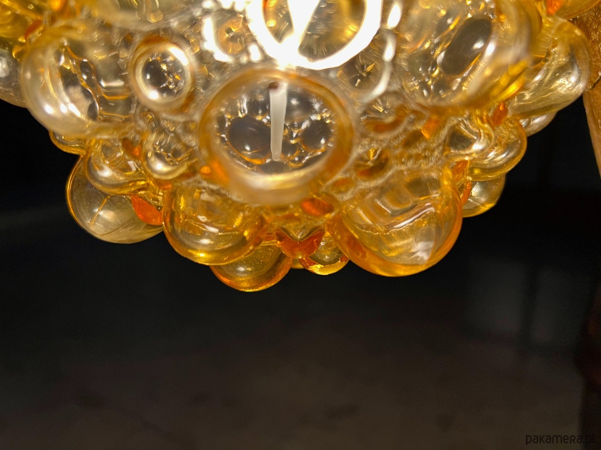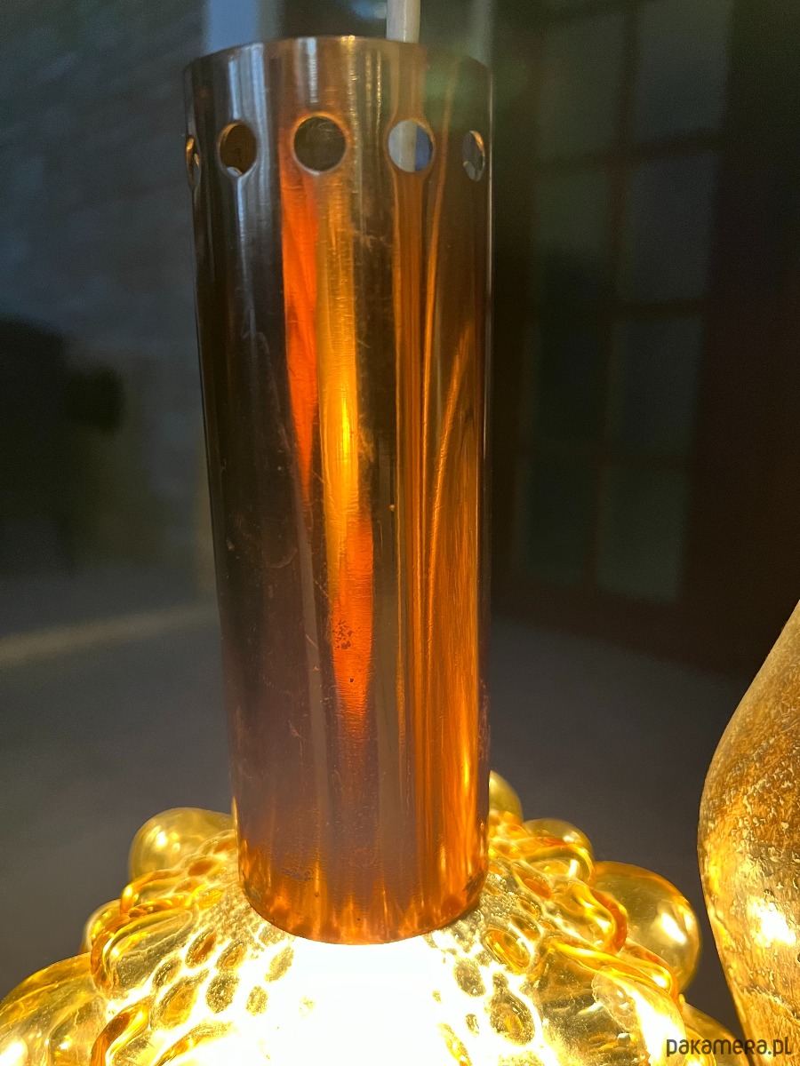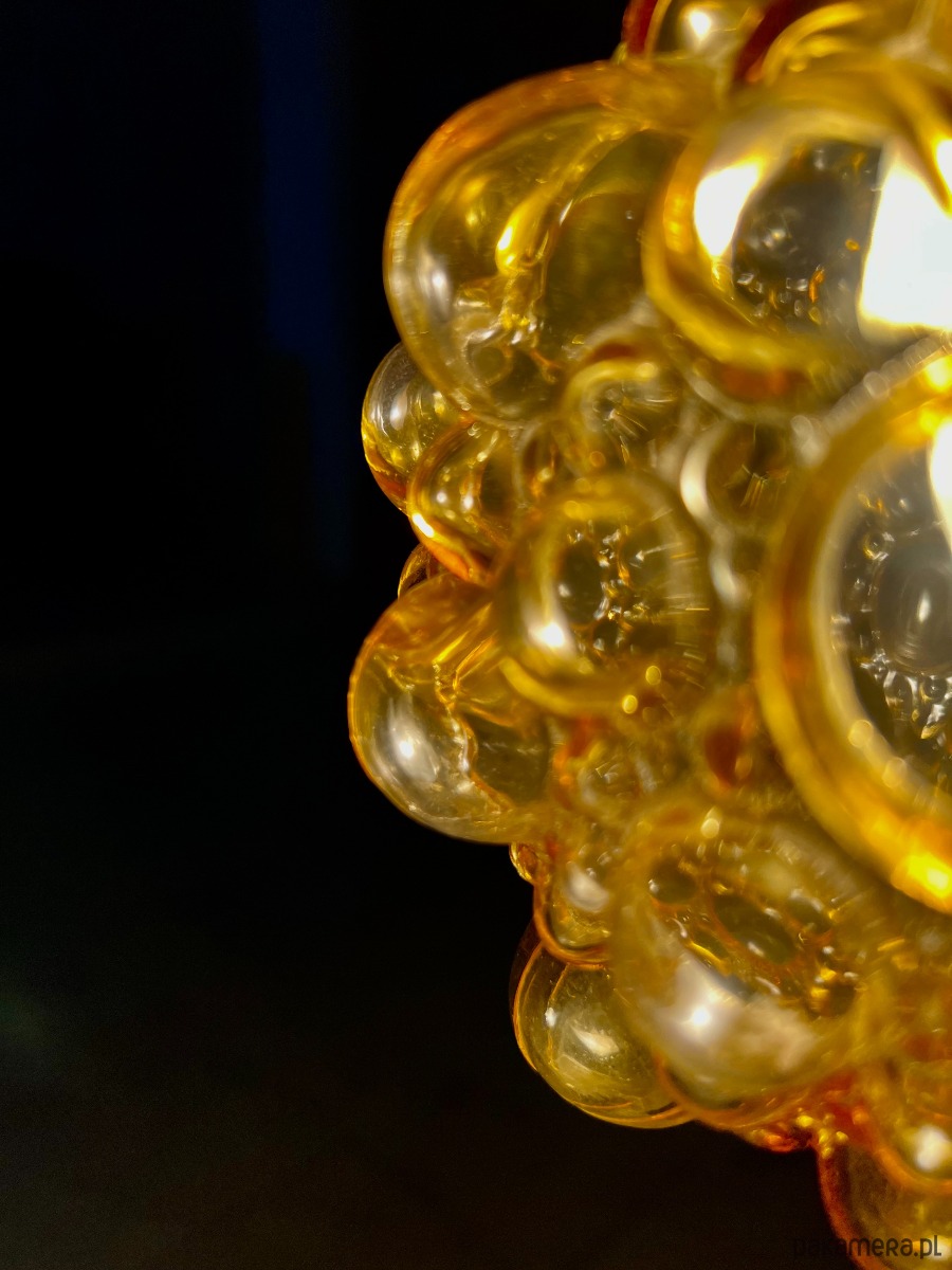 Lampy wykonane są z ręcznie formowanego szkła w kolorze bursztynowym (amber), z charakterystyczną strukturą „bubble glass” – efekt pęcherzy powietrza zatopionych w masie szklanej. Po zapaleniu szkło daje niezwykle ciepłe, dekoracyjne światło.