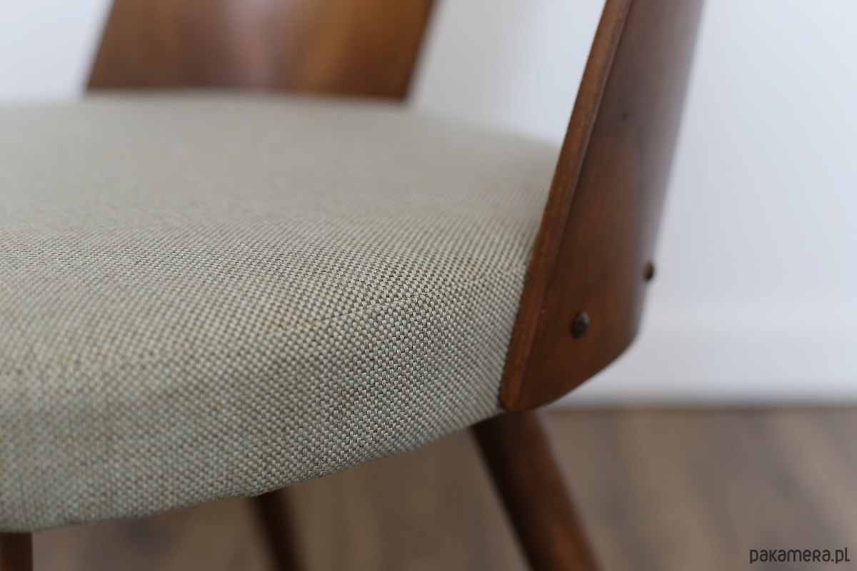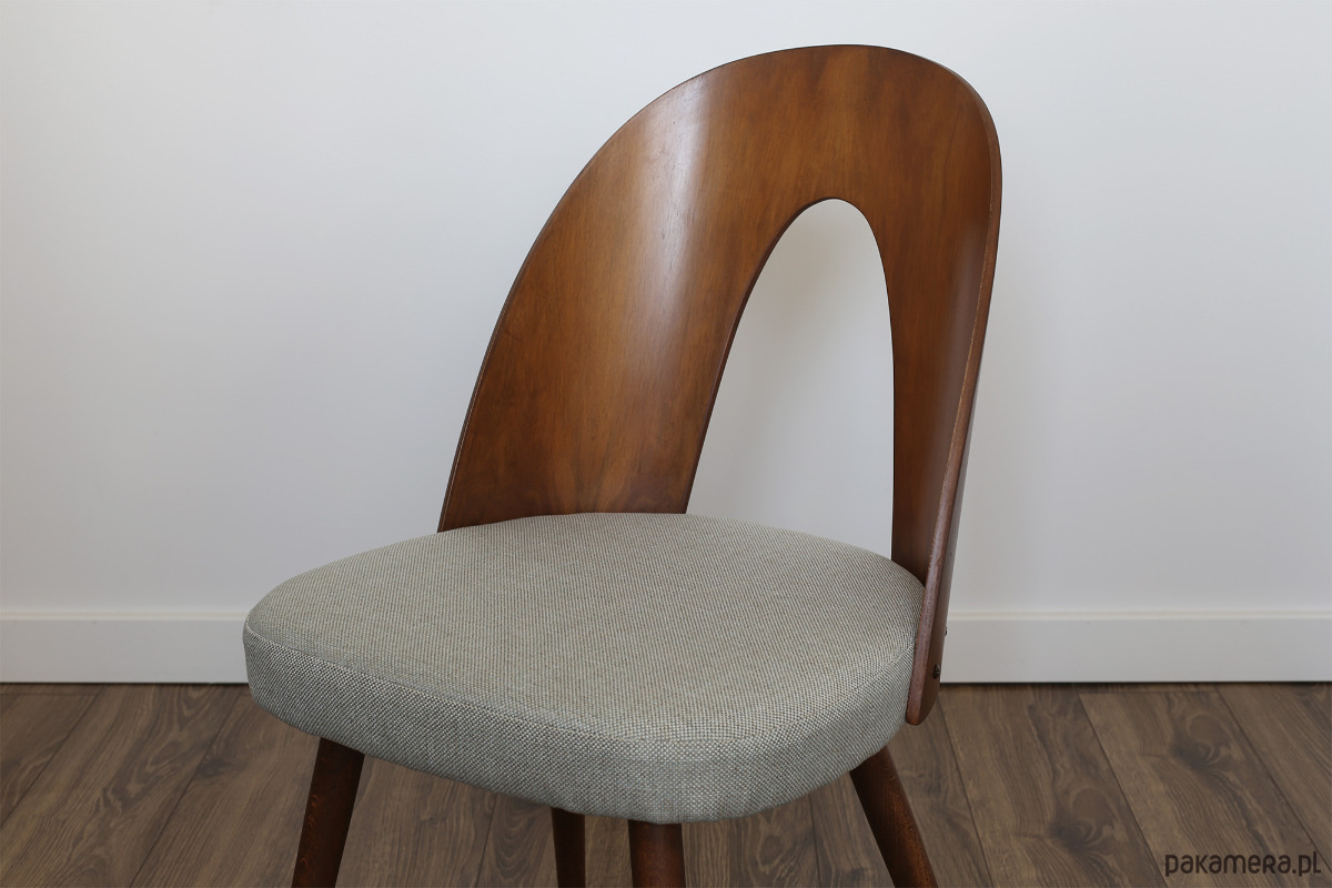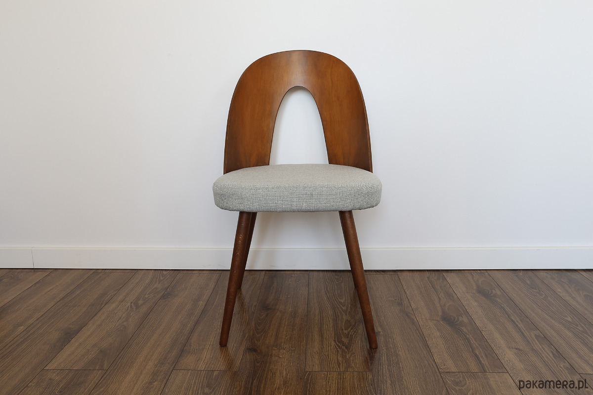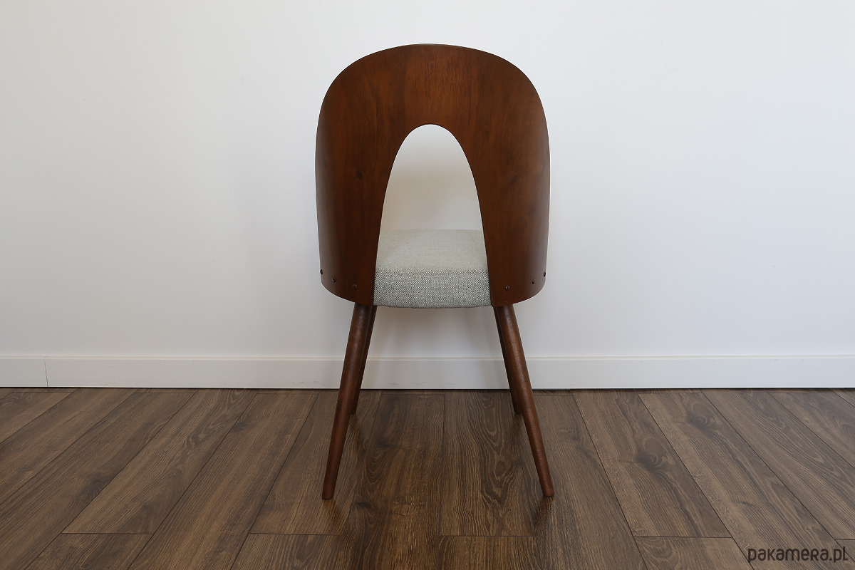Krzesła po kompleksowej renowacji, elementy drewniane zostały oczyszczone ze starych powłok i wykończone wysokiej jakości olejowoskiem do drewna marki Osmo. Siedzisko ma nowe wypełnienie i obite jest wysokogatunkową melanżową tkaniną w kolorze jasno szarym z błękitną nitką (odporność na ścieranie kategoria A >100 000 suwów). W tym modelu nogi wykonane są z litego drewna, a oparcie to fornirowana, gięta sklejka.